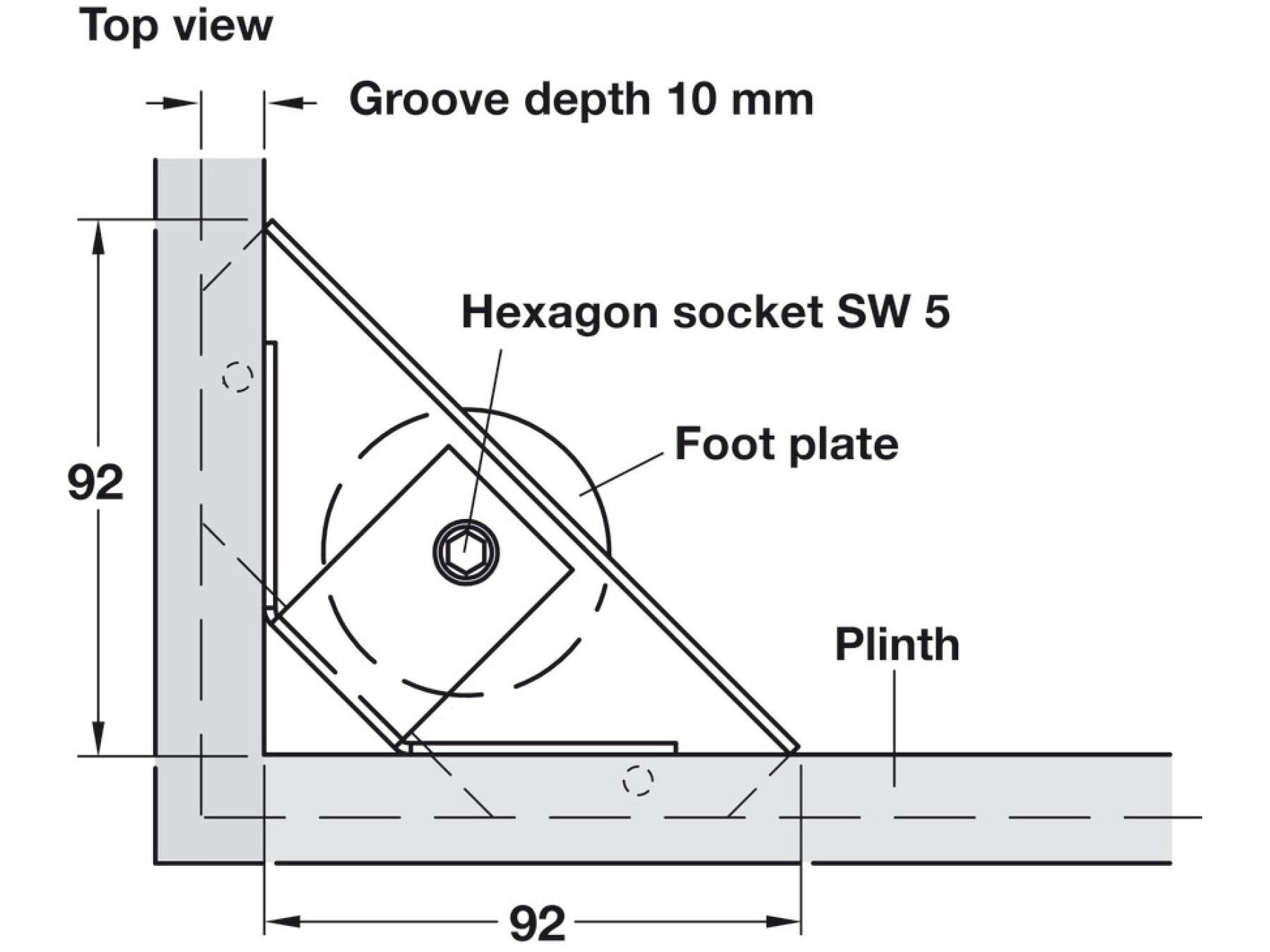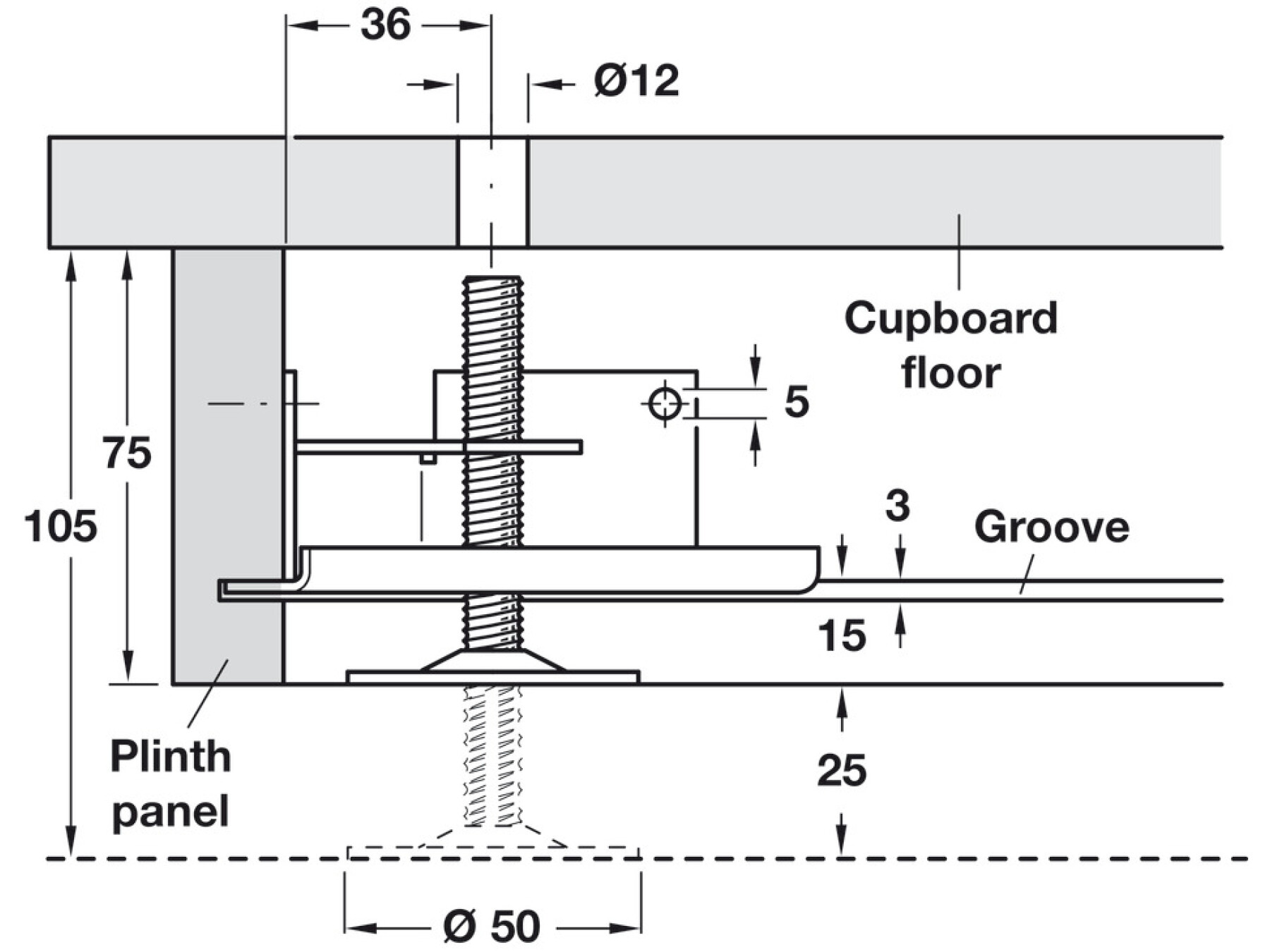Adjustable from above through Ø 12 mm aperture in the cupboard floor