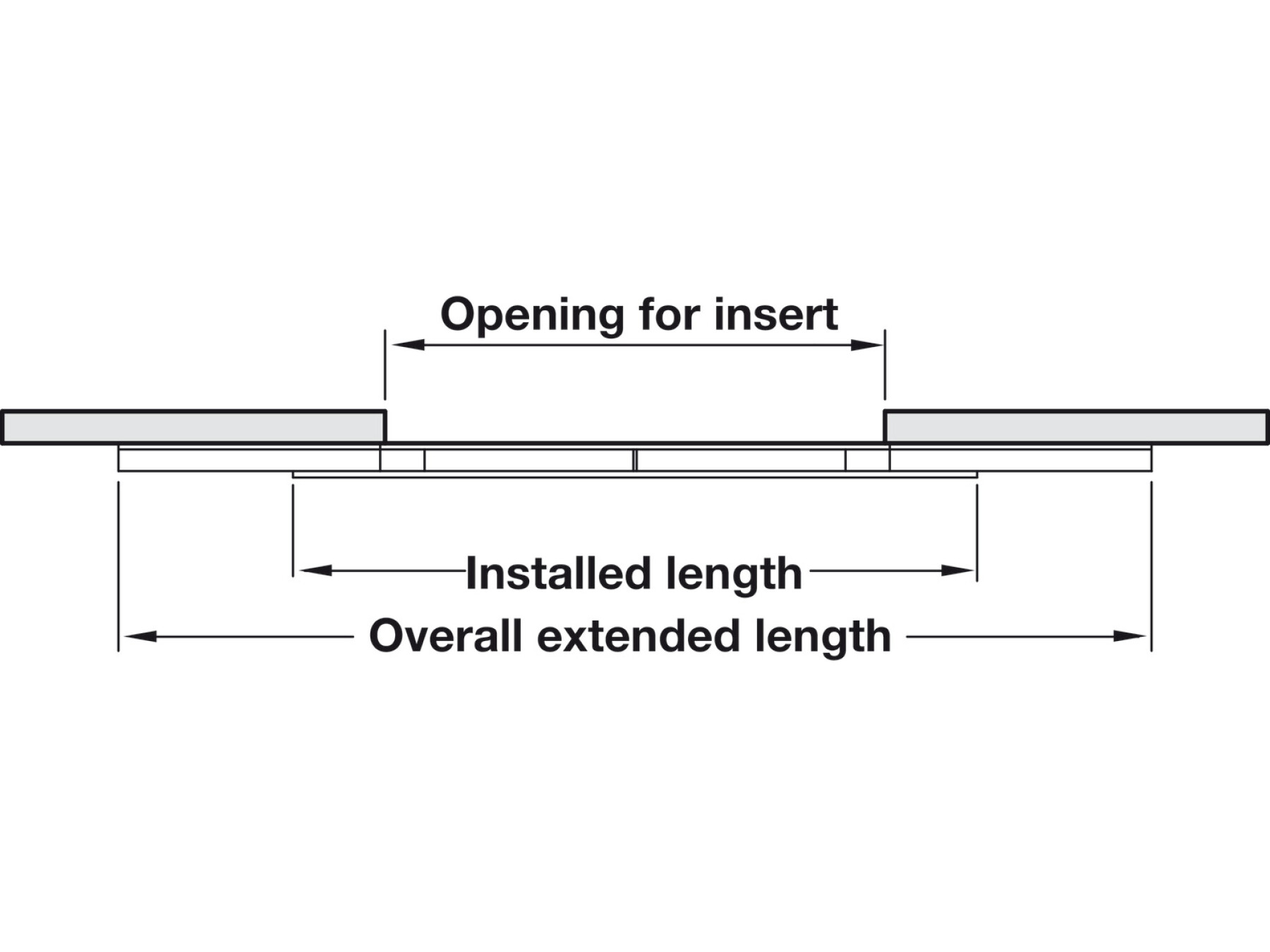 Installation length of pull out table fitting = approx. length of frame/base or approx. 2/3 of table Ø or table length without extension leaves