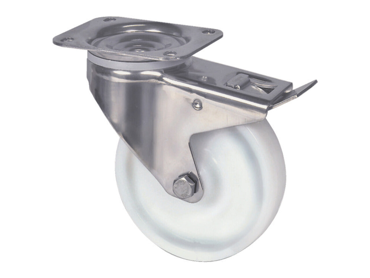 Housing and brake: Stainless steel. Wheel centre: Polyamide.