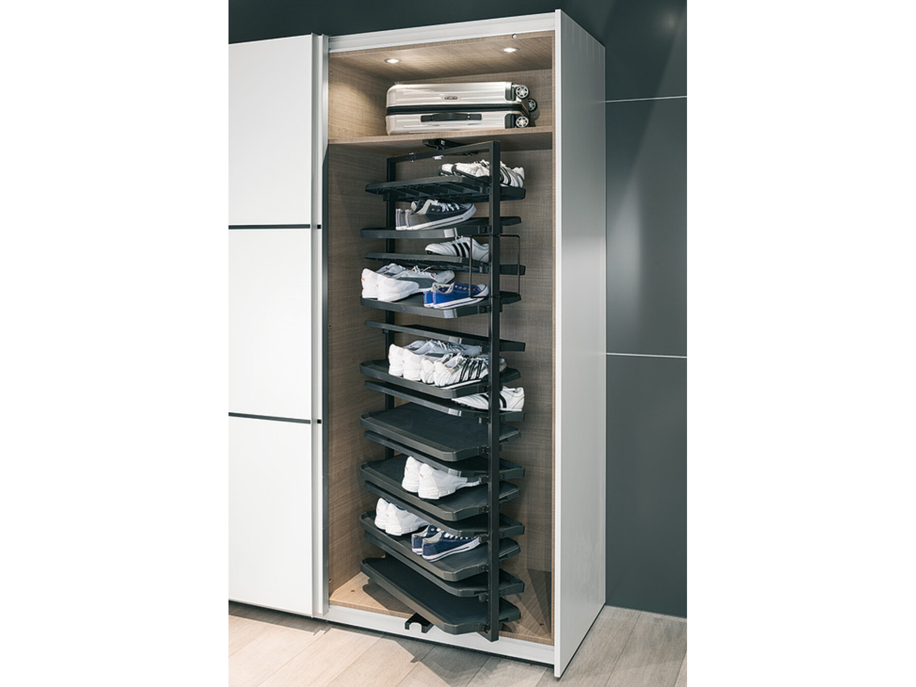 Pull out shelf with shoe shelves for up to 50 pairs of shoes
