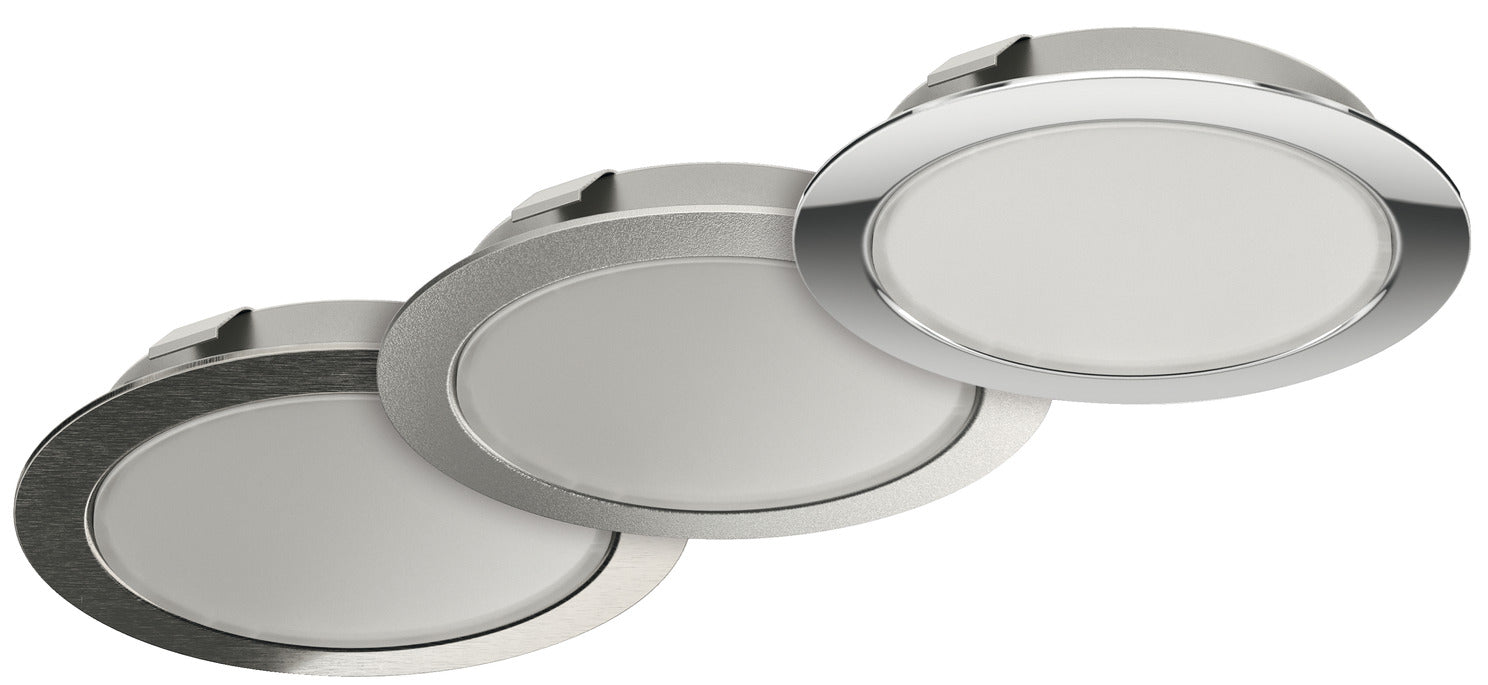 The homogenous light output impresses in a wide range of furniture and cabinetsBe it a recess mounting or mounting as a downlight, the 3W light always provides excellent colour rendering and illuminationPress fixingFor surface mounting, order bezel separatelyDimmable