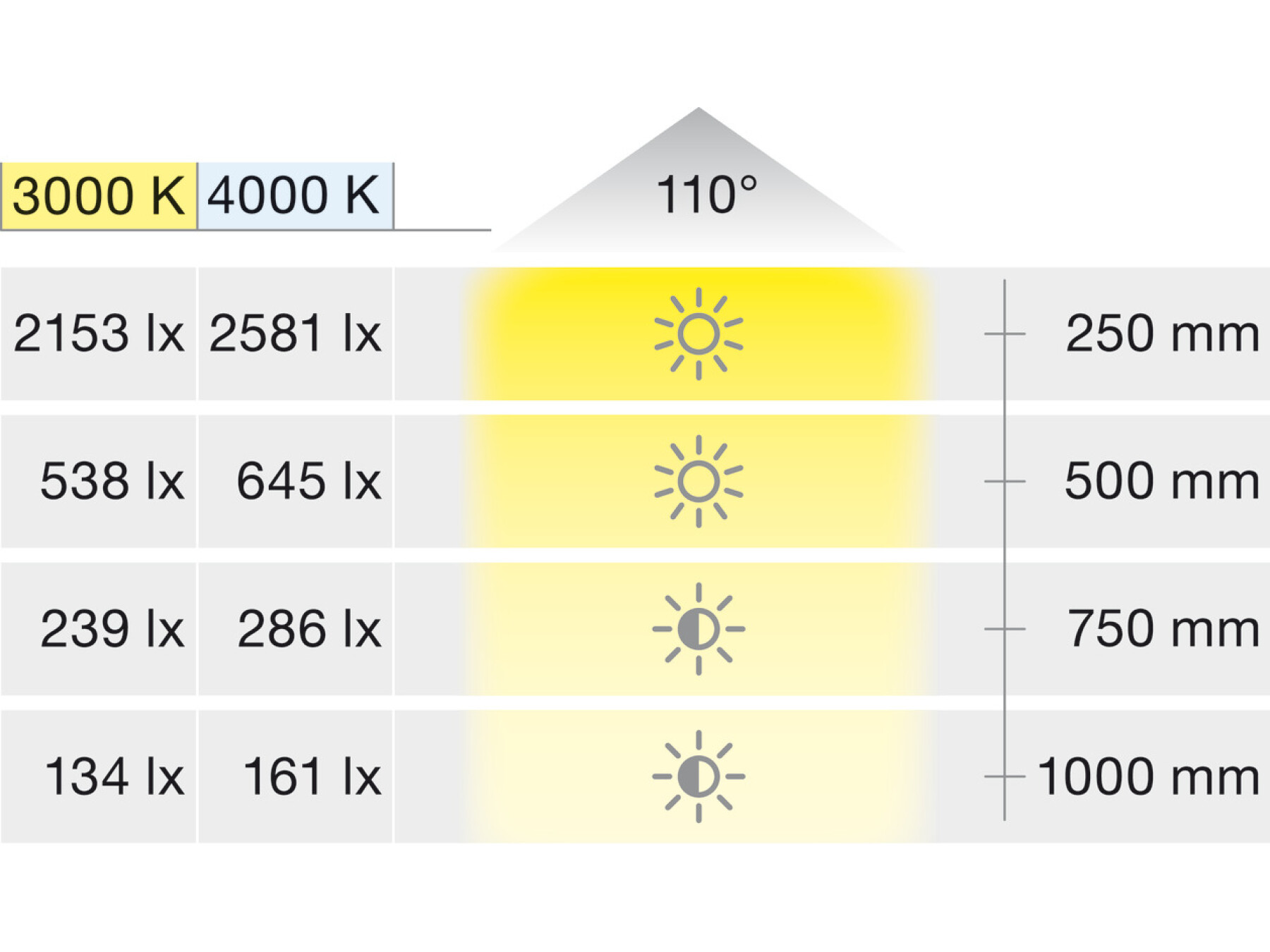 For uniform illumination of cabinets, kitchens and work areas