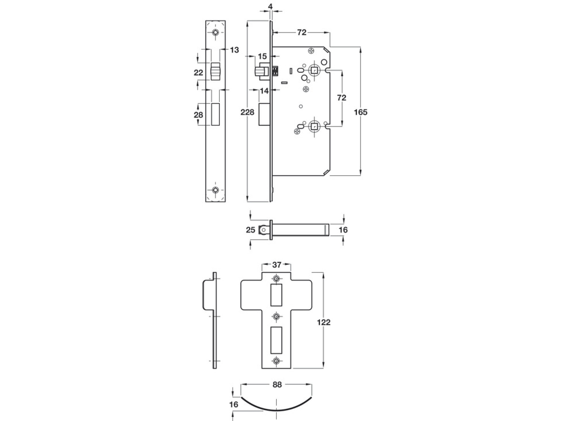Pierced to accept 38 mm centres horizontally and diagonally opposed bolt through lever furniture and horizontally opposed indicator furniture