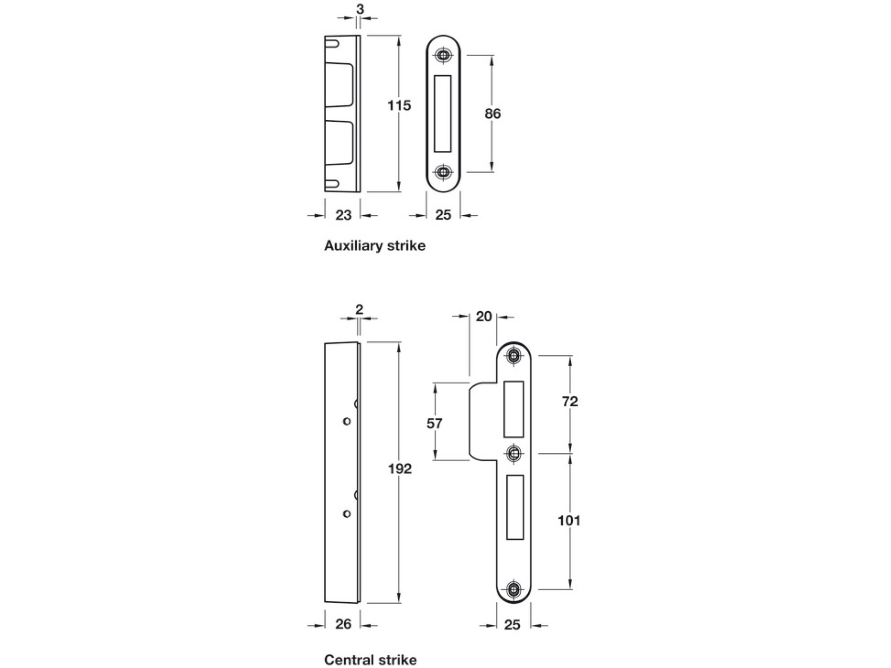 Strike plate: Radius box. 1x central strike, 2x auxiliary strikes included. Zinc plated