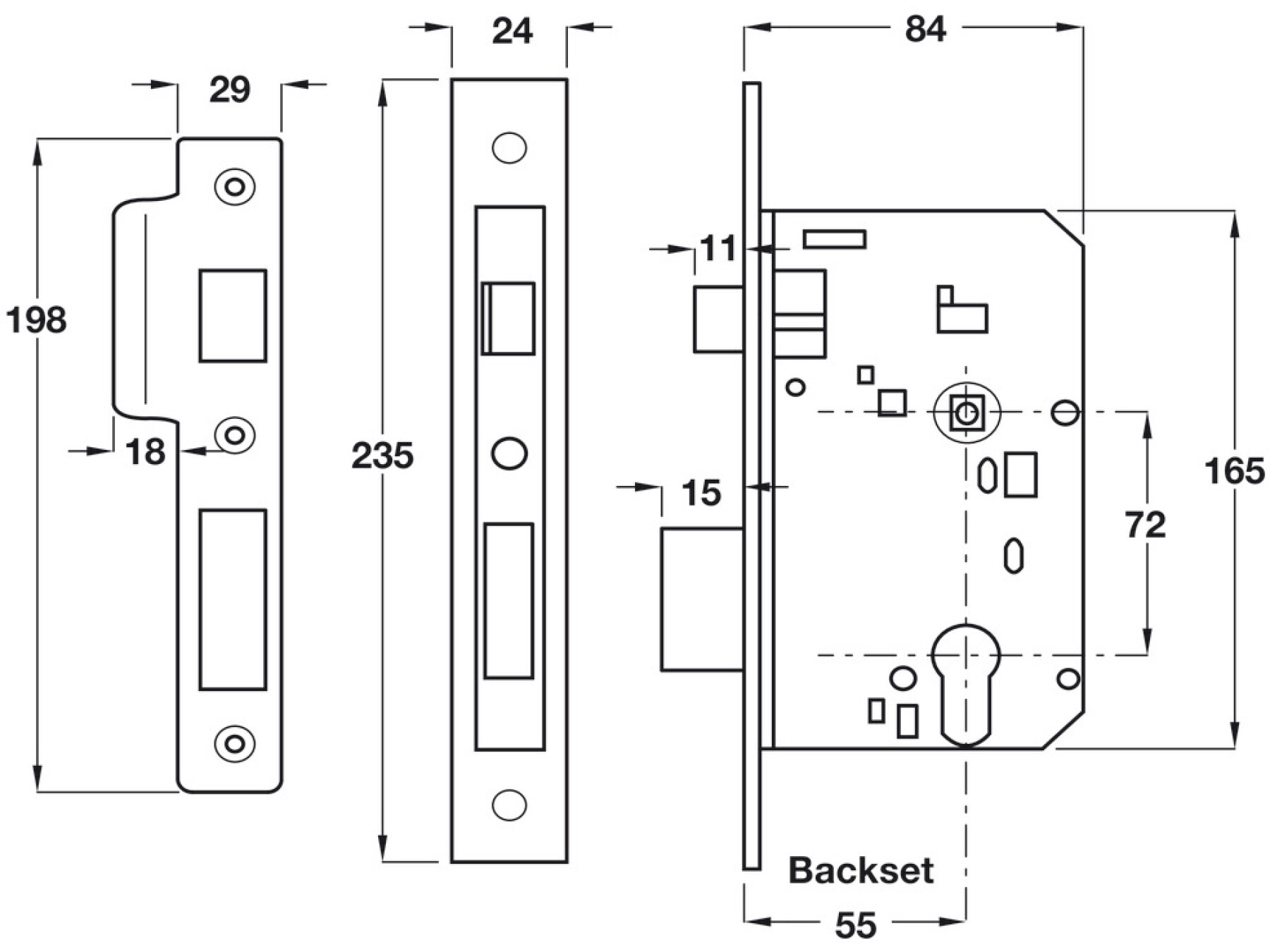 Backset 55 mm, case size 84 mm, satin stainless steel