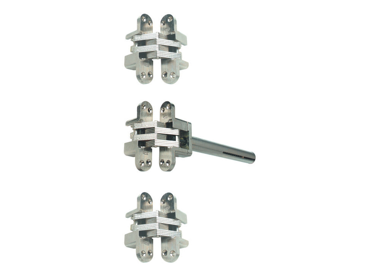 Set includes 3x ‘Soss 218’ concealed mortice hinges, one incorporating the spring mechanism