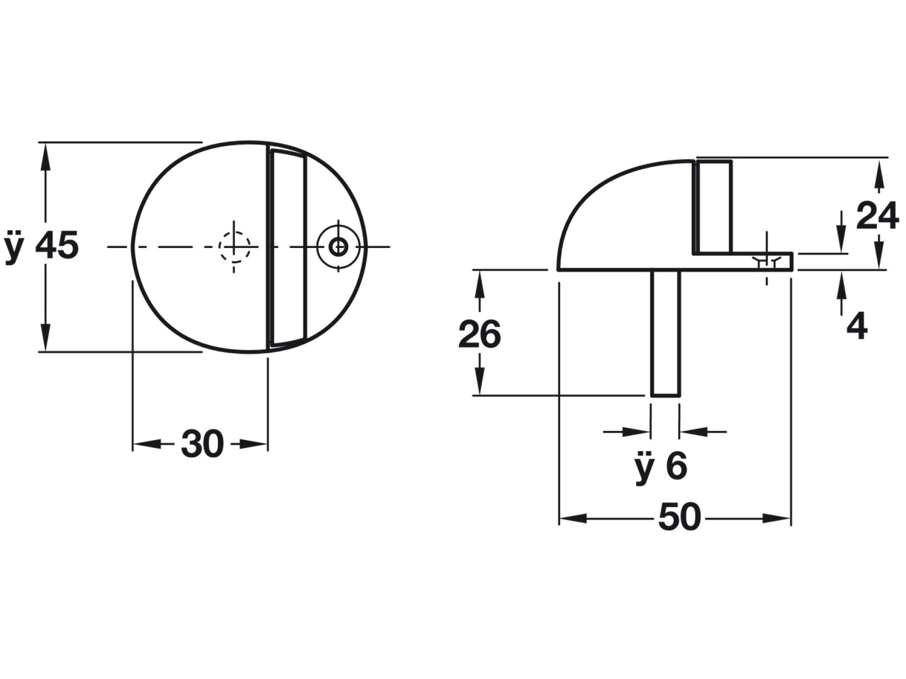 With its compact profile—45.00 mm diameter and 24.00 mm height—this floor-mounted door stop fits neatly into modern interiors without looking bulky. The anodized, polished finish delivers a refined appearance that complements contemporary door hardware, while the rubber element provides a reliable grip and cushioning effect when the door closes.
