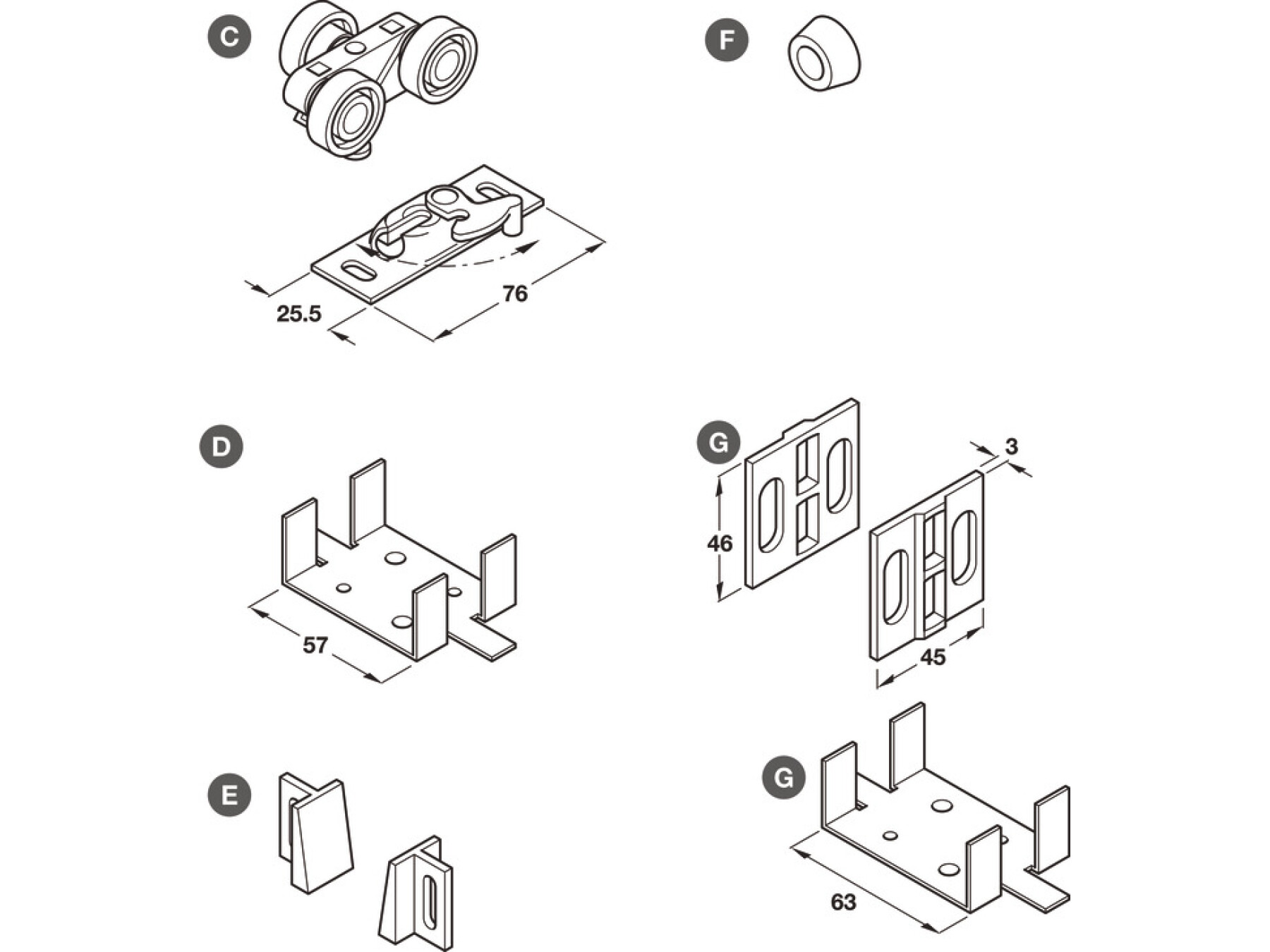 Set consists of 1 x assembly, with pre-fitted track, 1 x Steel wrapped studs, provides stability set, 2 x Hangers with 3 wheels, steel mounting plate, nylon rollers, 2 x Floor plates, steel, 2 x Bottom guides, nylon, 1 x Door stop, rubber, 1 x Frame adaptor set, 35-44 mm door thickness