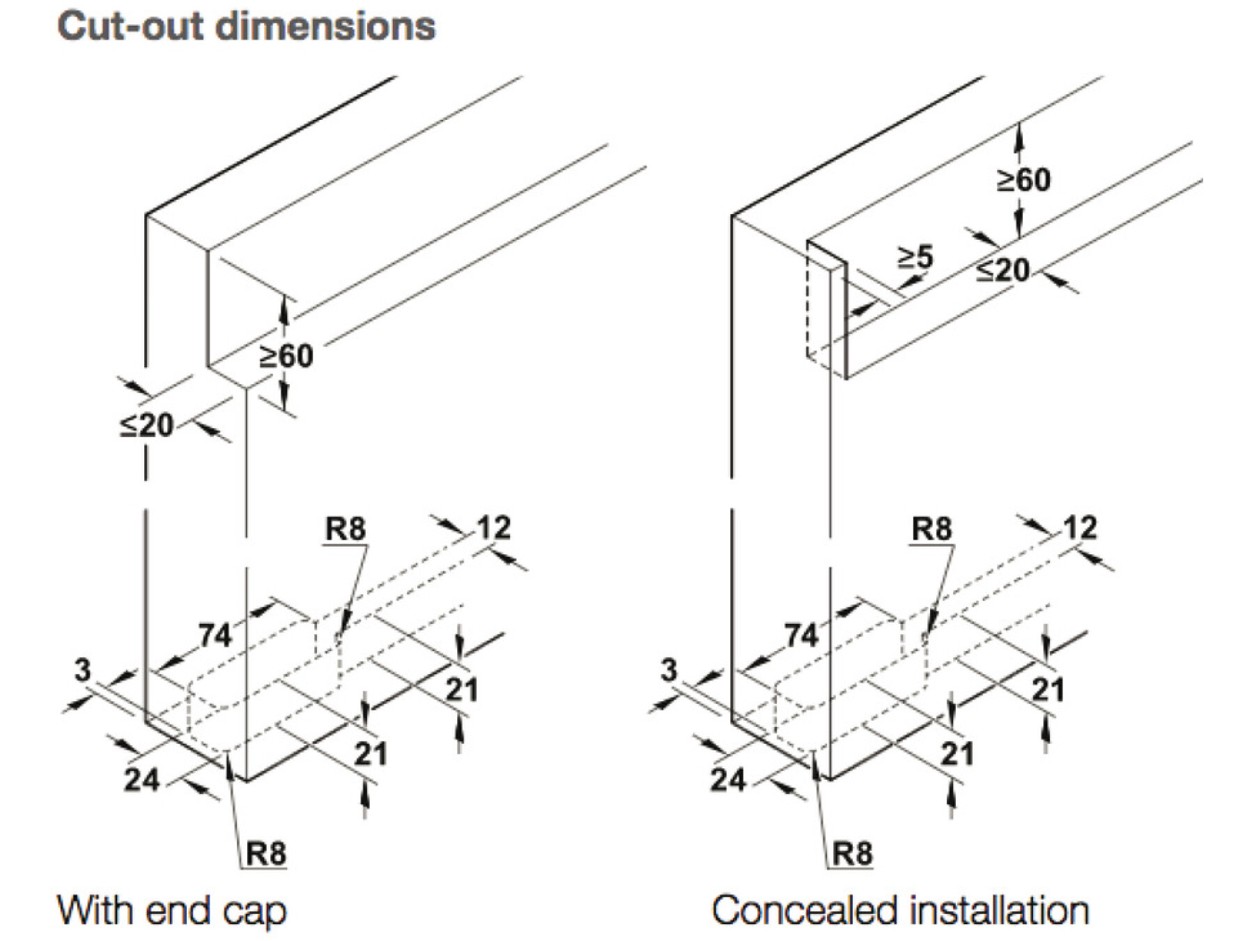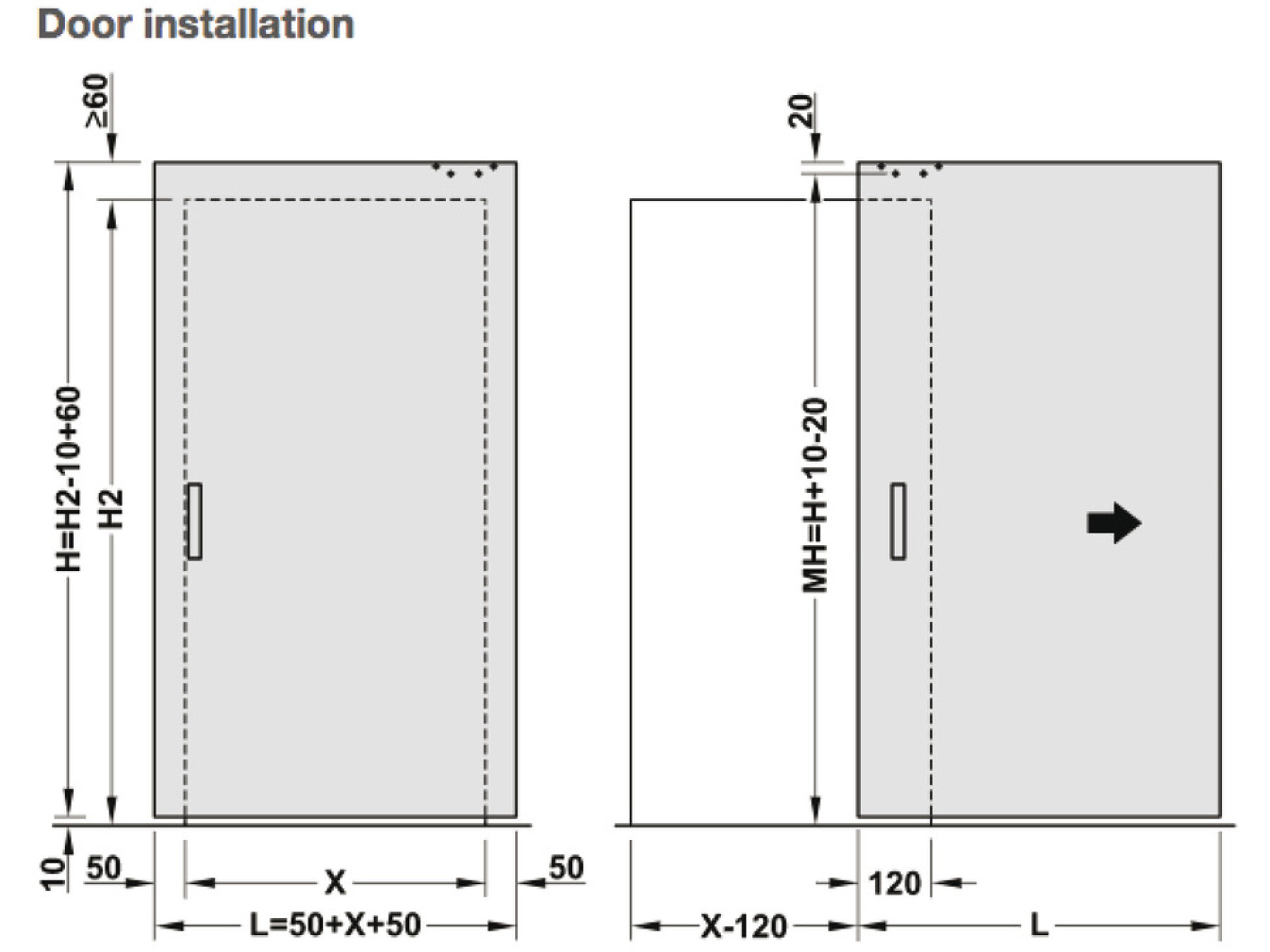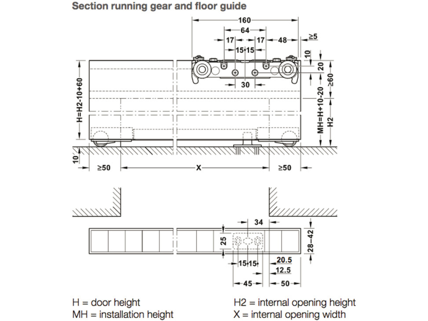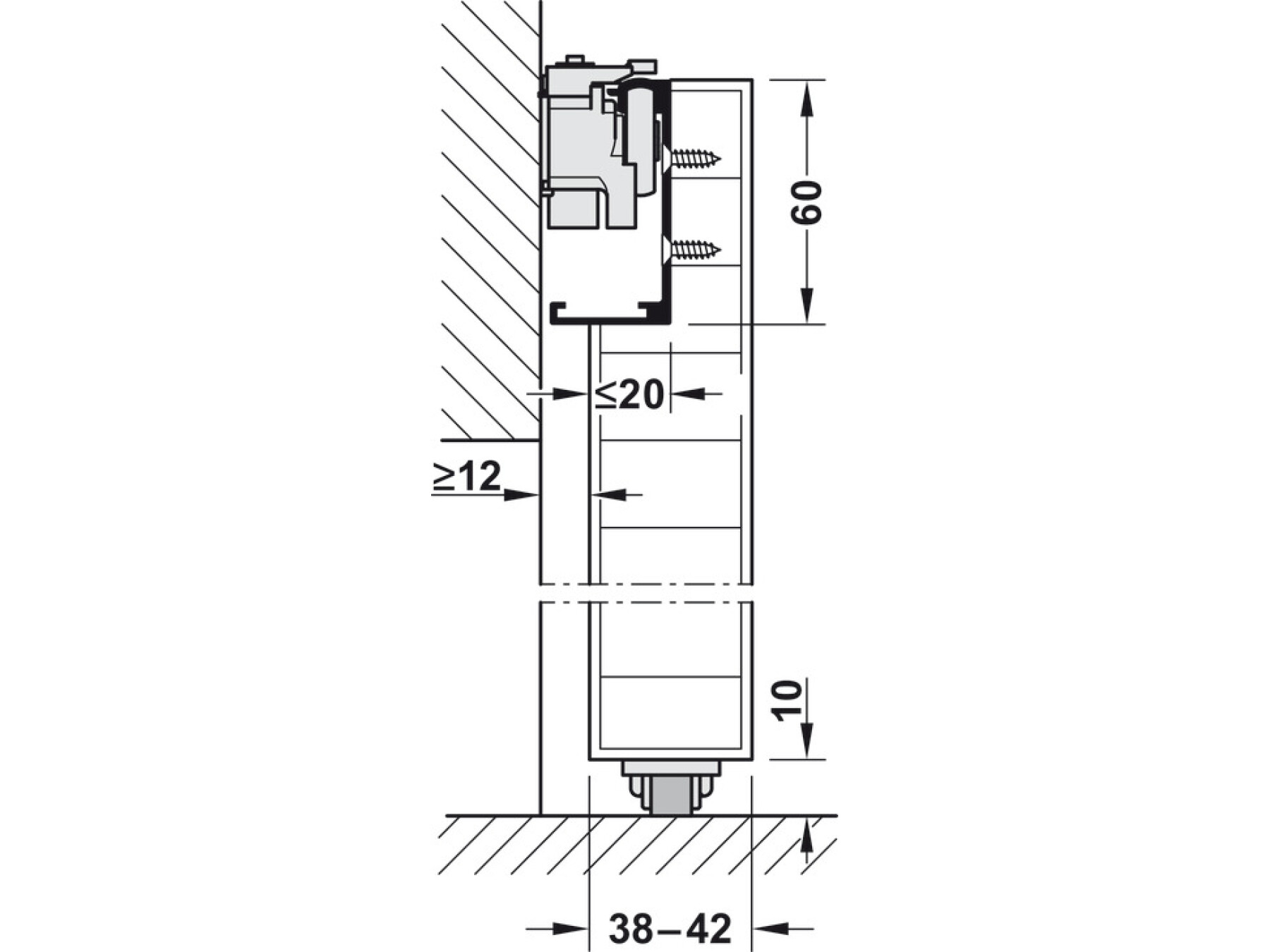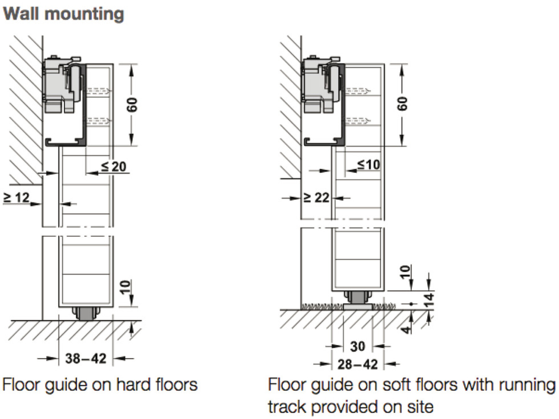 Top track can be recessed into the door for a wall to door clearance of 12 to 22 mm or face fixed with a clearance of 32 mm for skirting boards