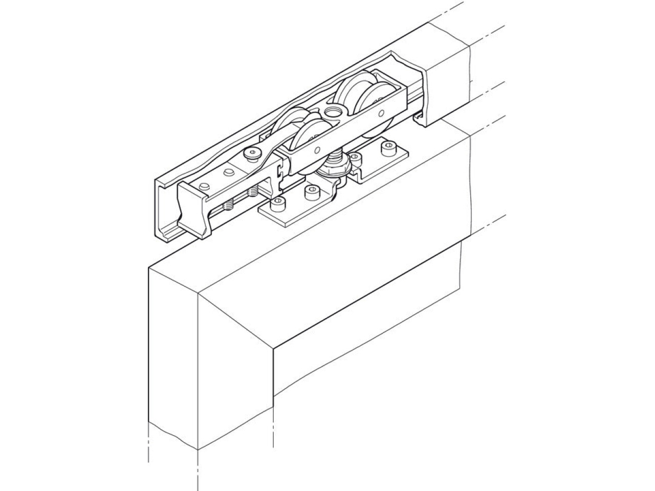 Fitting set for one door consists of 2 x Junior 80/M track stopper, for adjustable mounting in top track, zinc alloy, black painted housing, adjustable retaining force, 2 x Junior 80/M trolley hanger, sleeve bearing mounted Ø 34 mm high grade polyamide tandem rollers, galvanised steel fixing plate with M10 hanger bolt, fixing included, 1 x Guide, clear threshold applications only, for screw mounting to floor, grey plastic, 30 x 80 x 30 mm, 1 x Rubber buffer. Ø 19 x 10 mm, for screw fixing
