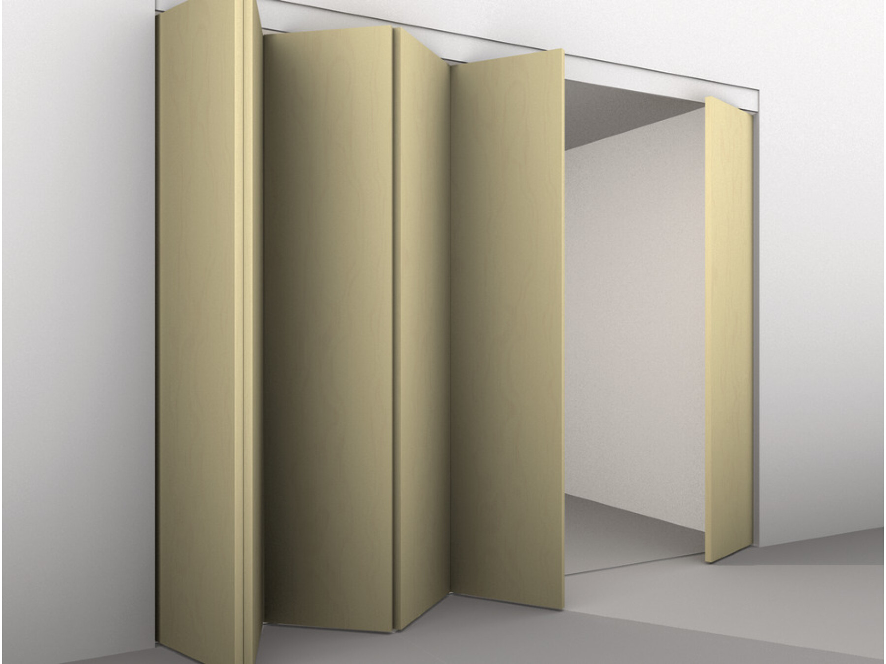 A pivot bearing secures the first panel in the set, the others attach by means of stainless steel hinges that bring the panels closer together and minimise panel stacking requirements