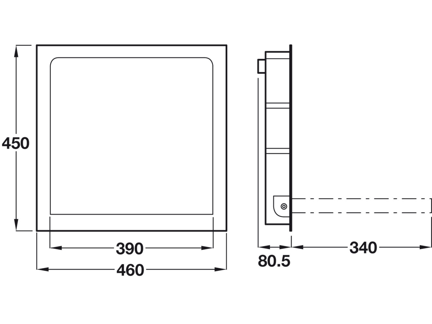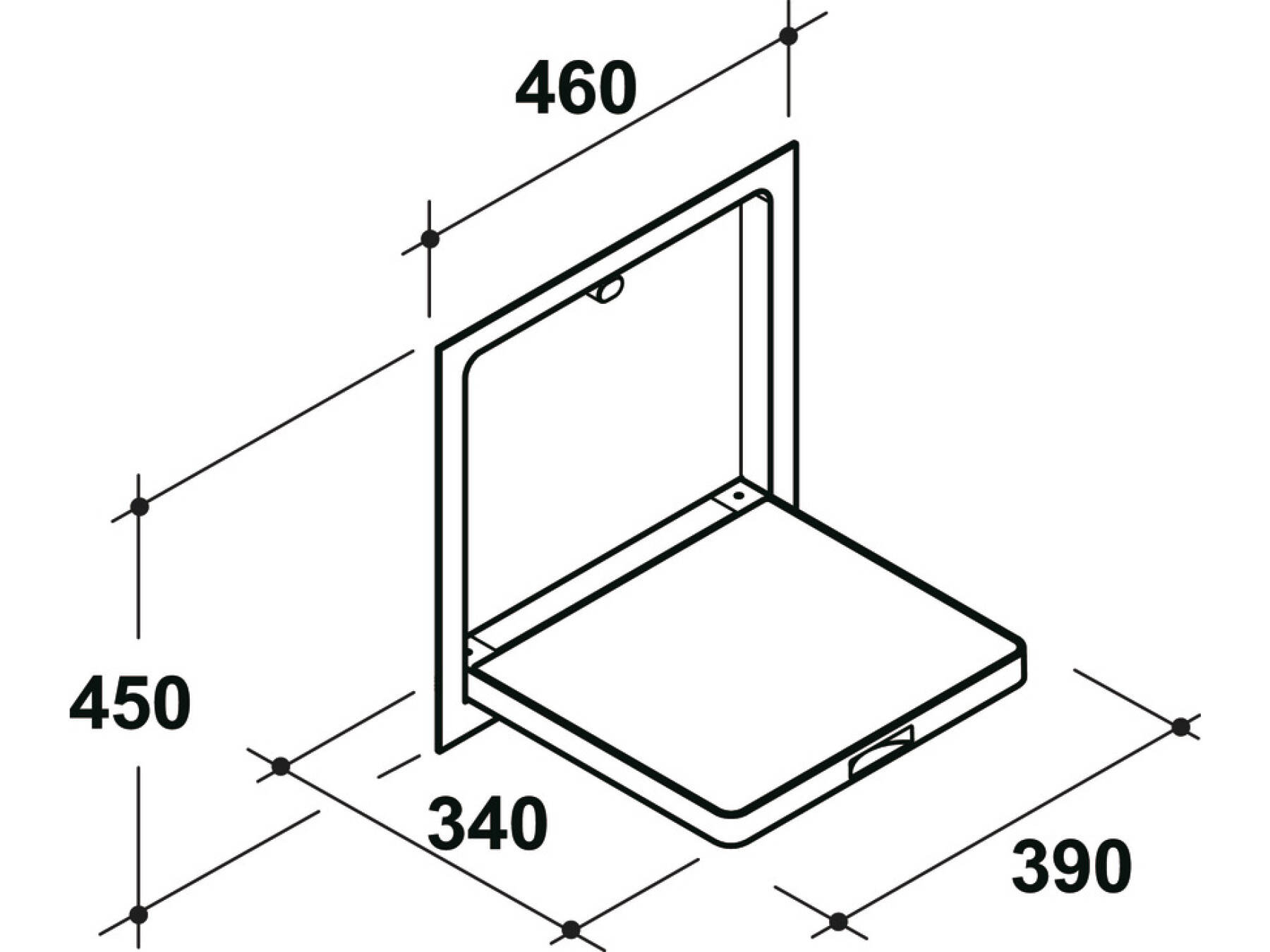 Seat stands 340 mm proud from the wall when tilted down and is 390 mm wide