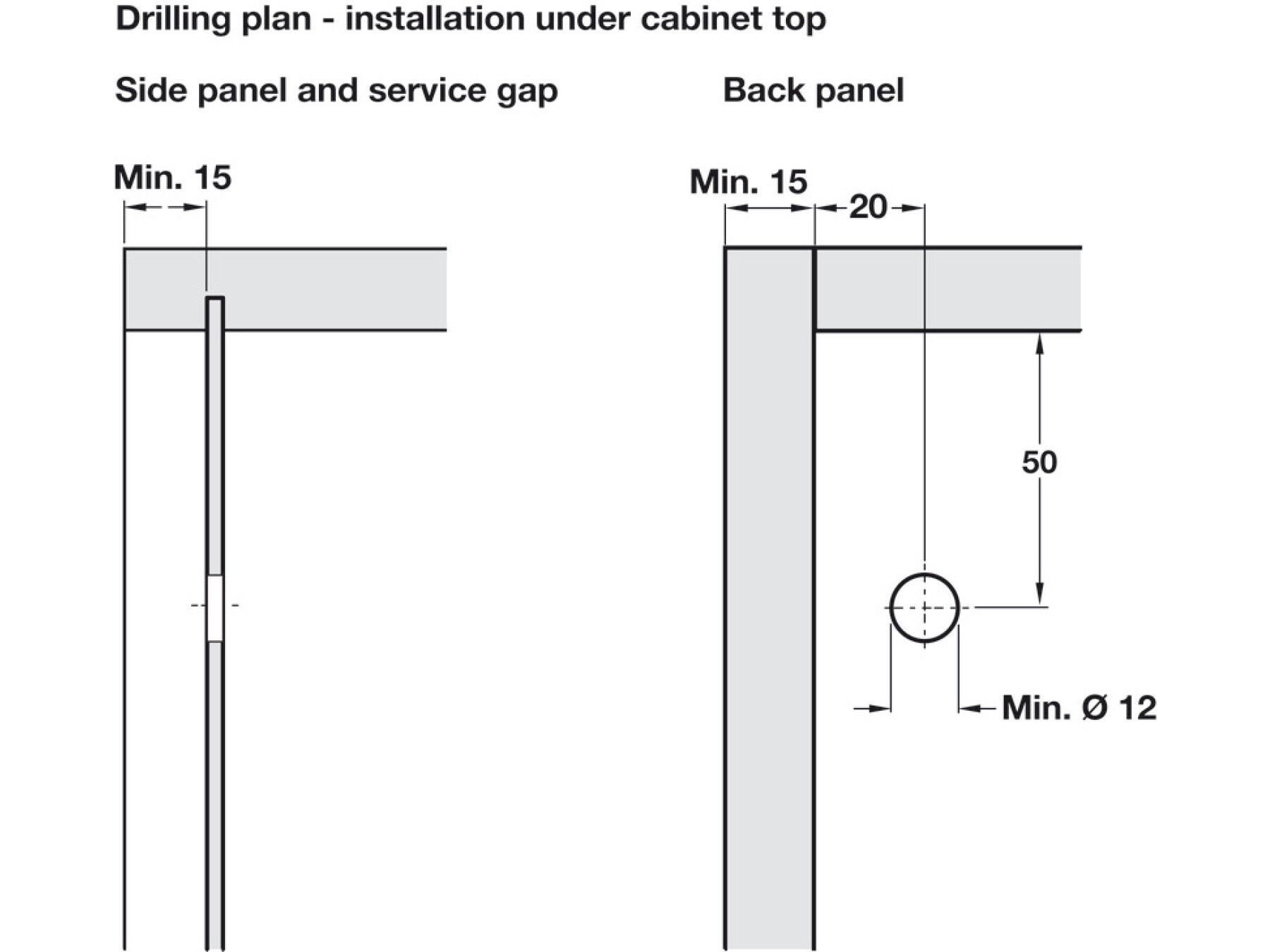 Ø 12 mm hole in back board required for access to fitting