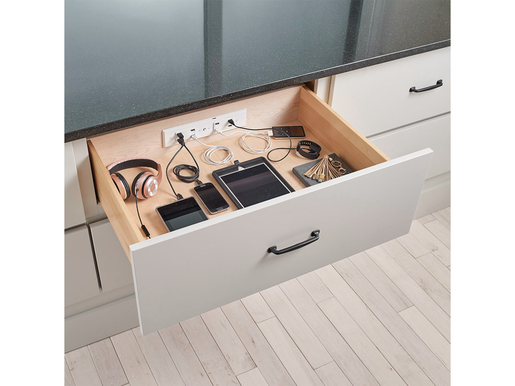 In-drawer outlets, recommended for use in any drawer or piece of furniture, kitchens, bathrooms, home offices and bedrooms