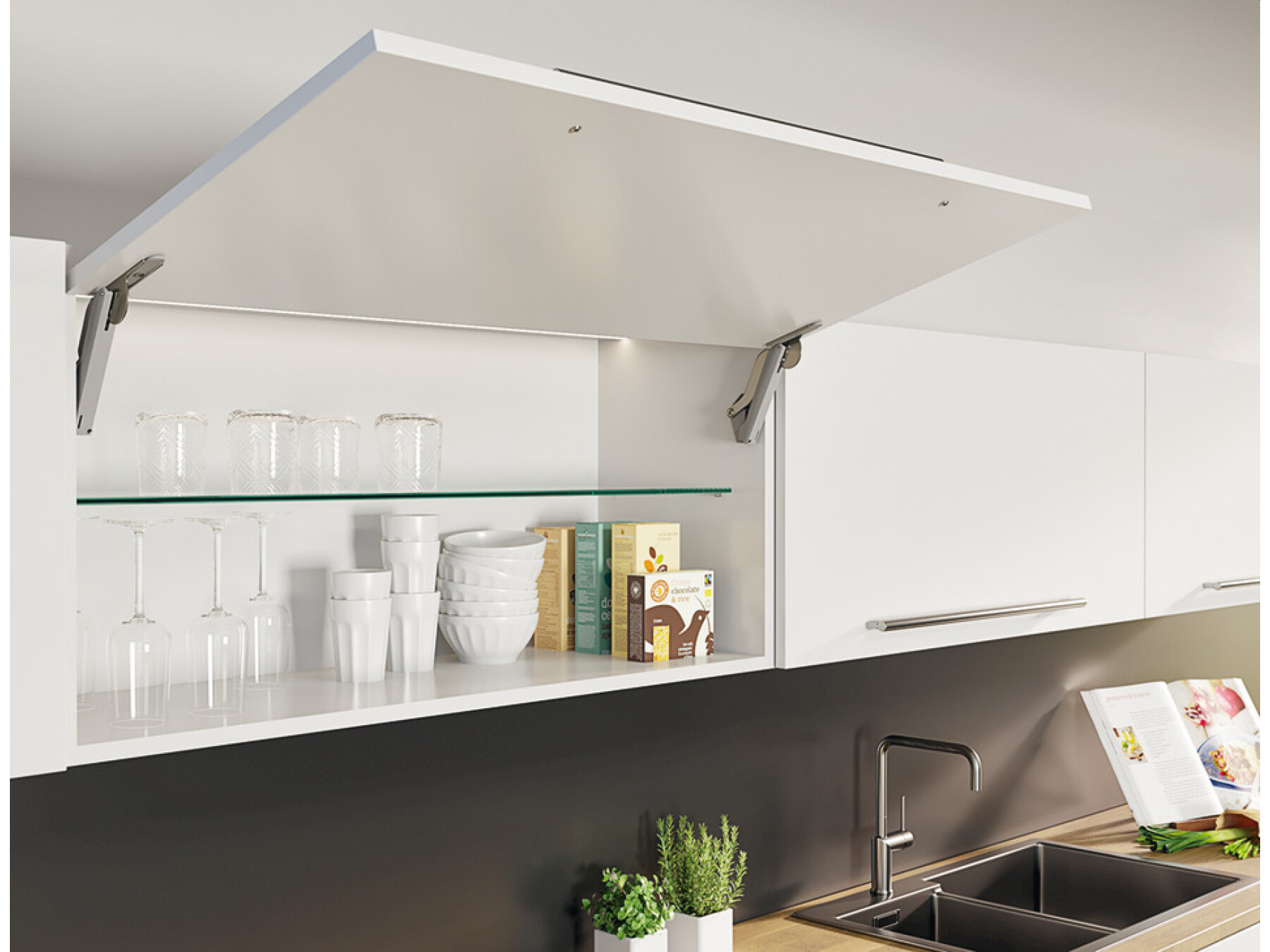The choice of stay flap fitting for front panels with handle depends on the cabinet height and flap weight including handle.