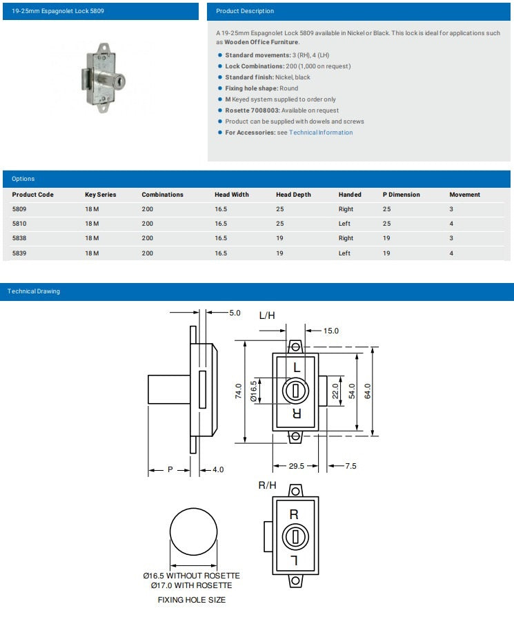 L&F 5809 (25MM) / 5838 (19MM) ESPAGNOLET LOCK