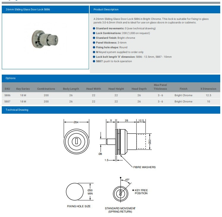 A 26 mm Sliding Glass Door Lock 5886 in Bright Chrome. This lock is suitable for fixing to glass panels 3.0-6.0 mm thick and is ideal for use on glass doors in cupboards or cabinets.