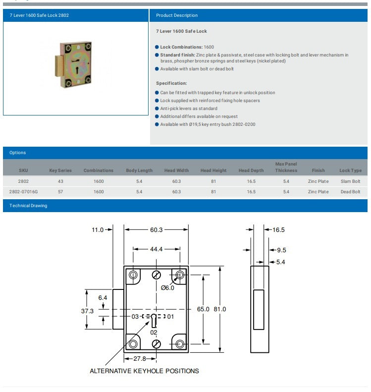 Standard finish: Zinc plate & passivate, steel case with locking bolt and lever mechanism in brass, phospher bronze springs and steel keys (nickel plated)