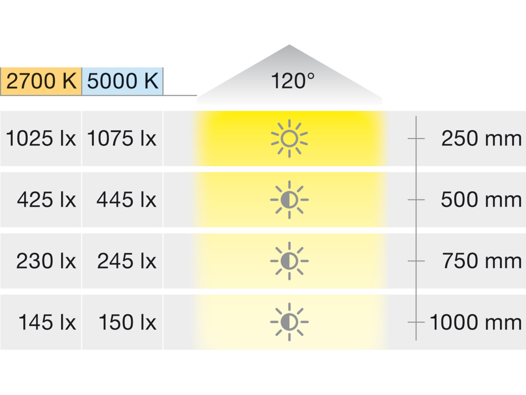 Maximum recommended strip light length for optimum visual light output: 4.5 m