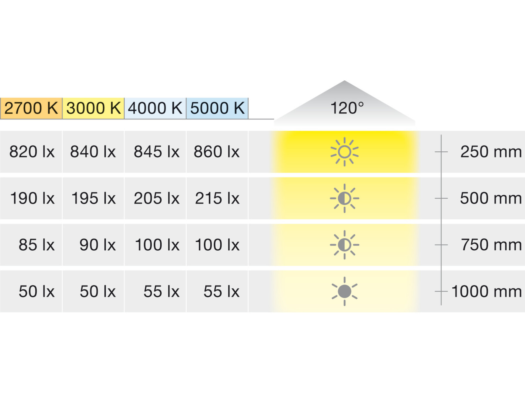 Maximum strip length (visual) describes a strip section with a visually imperceptible drop in luminous flux of max. 30%. Please note: A strip section with a new power supply that follows immediately is noticeably brighter. Max. wattage-dependent strip length on the driver, see technical data for LED strip lights