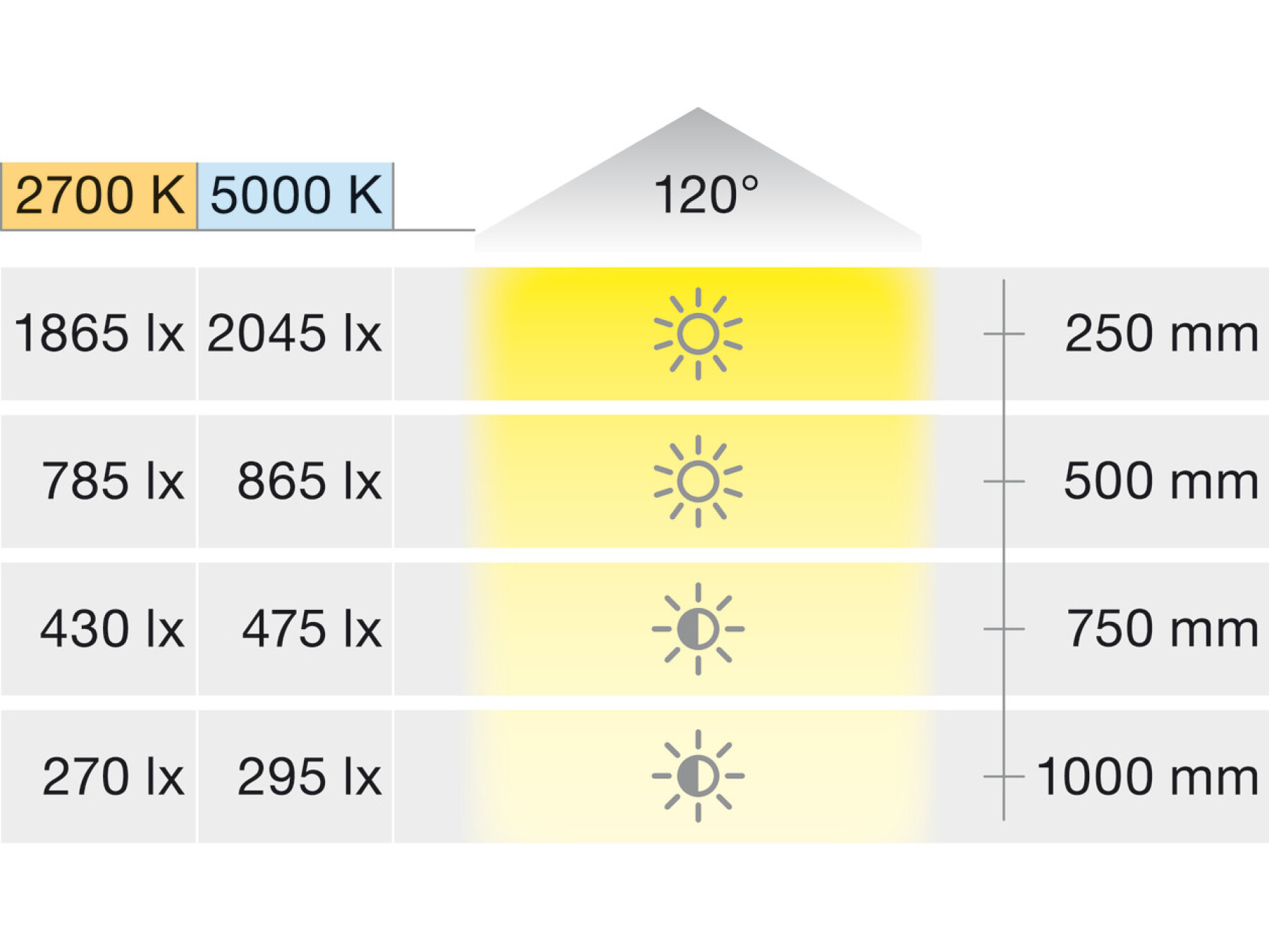 Maximum strip length (visual) describes a strip section with a visually imperceptible drop in luminous flux of max. 30%. Please note: A strip section with a new power supply that follows immediately is noticeably brighter.