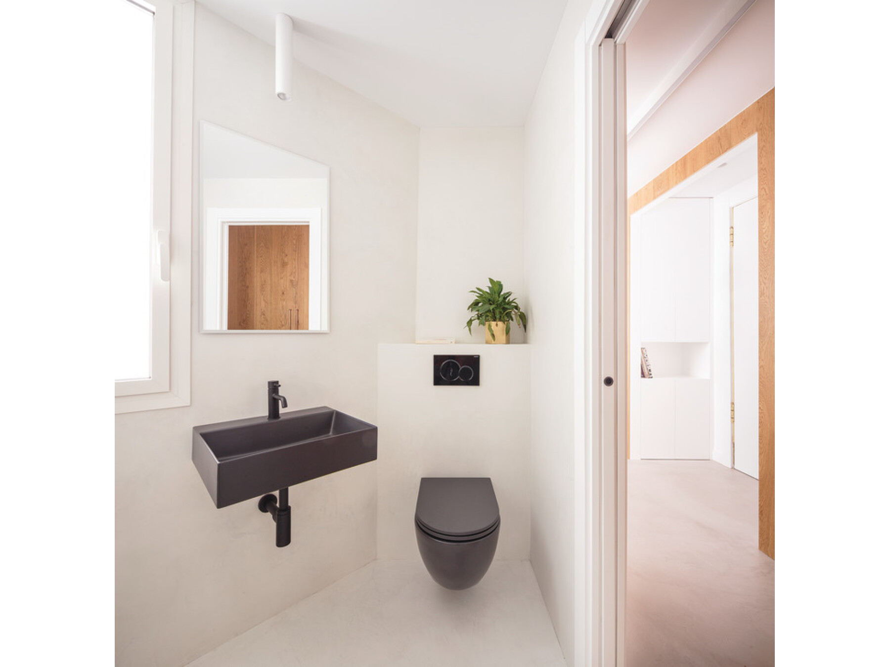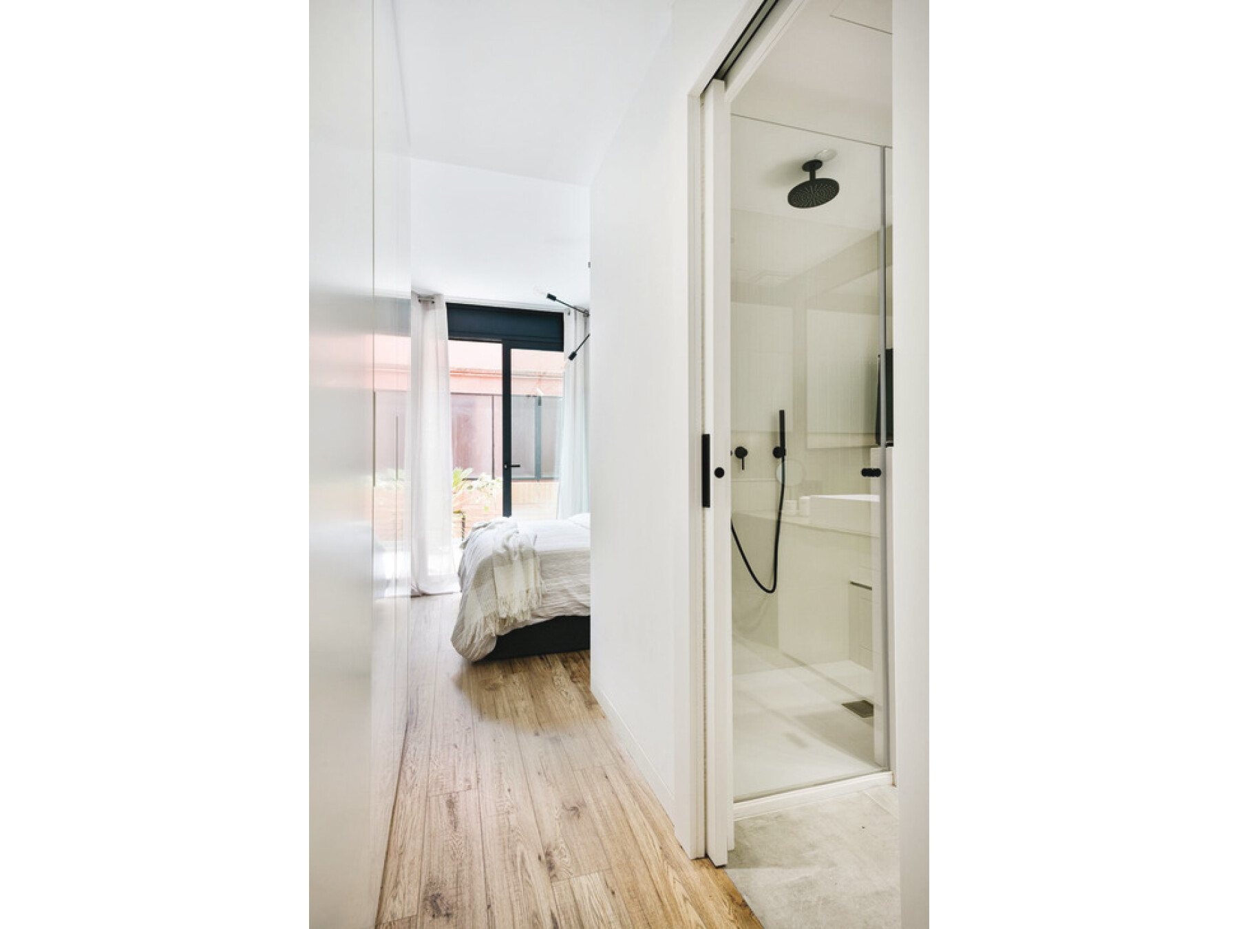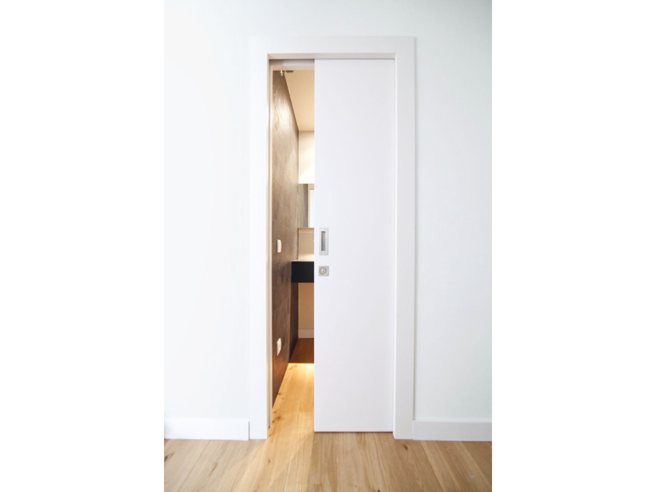 High quality straight sliding pocket door system for residential and commercial applications. Visual continuity thanks to its minimal visual impact in the space