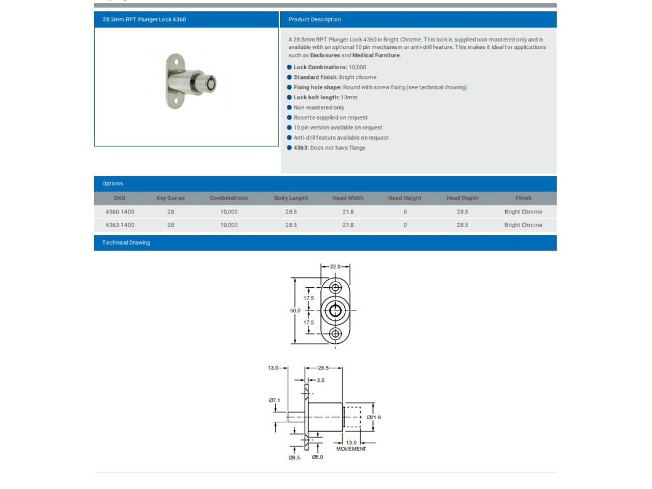 Positioned within the Furniture Fittings, Living & Commercial Solutions , Locks, Catches & Bolts , Cabinet Locks & Systems , Cam Lock category, the RADIAL PIN PLUNGER LOCK 4360 is ideal for drawers, cabinet doors, and compartments where you need consistent locking performance without bulky hardware. Its radial pin plunger design helps provide a firm, dependable engagement—helping protect stored items while keeping operation smooth and straightforward for users.