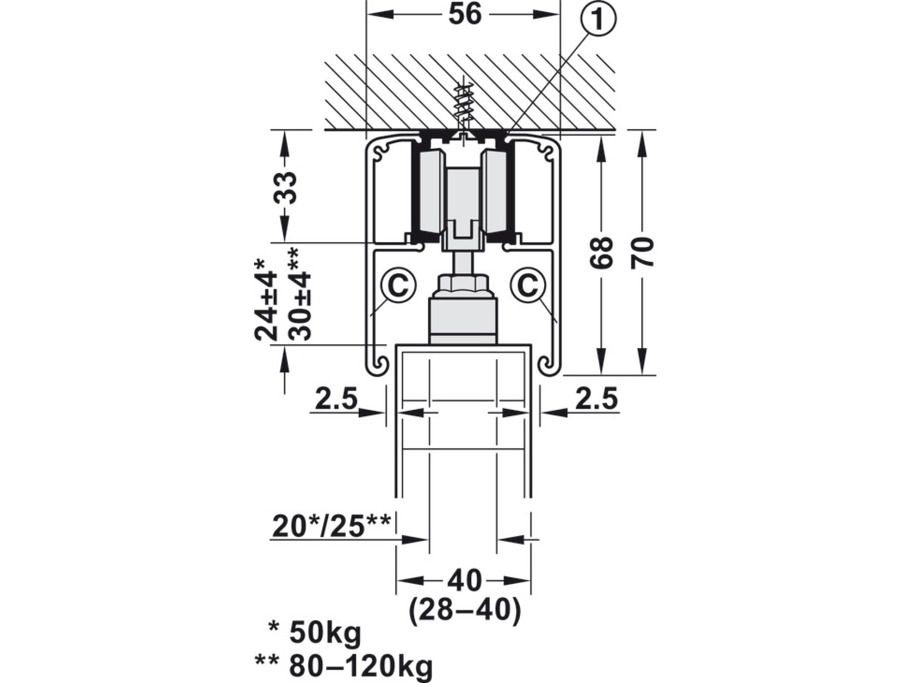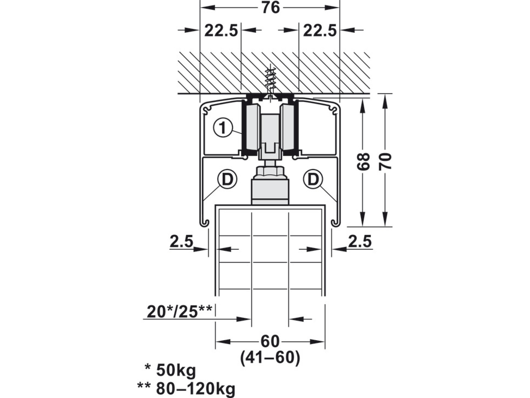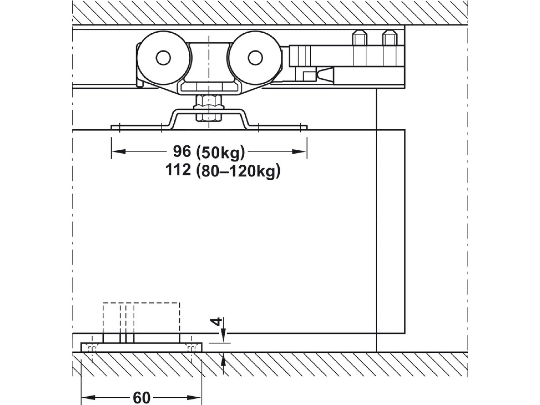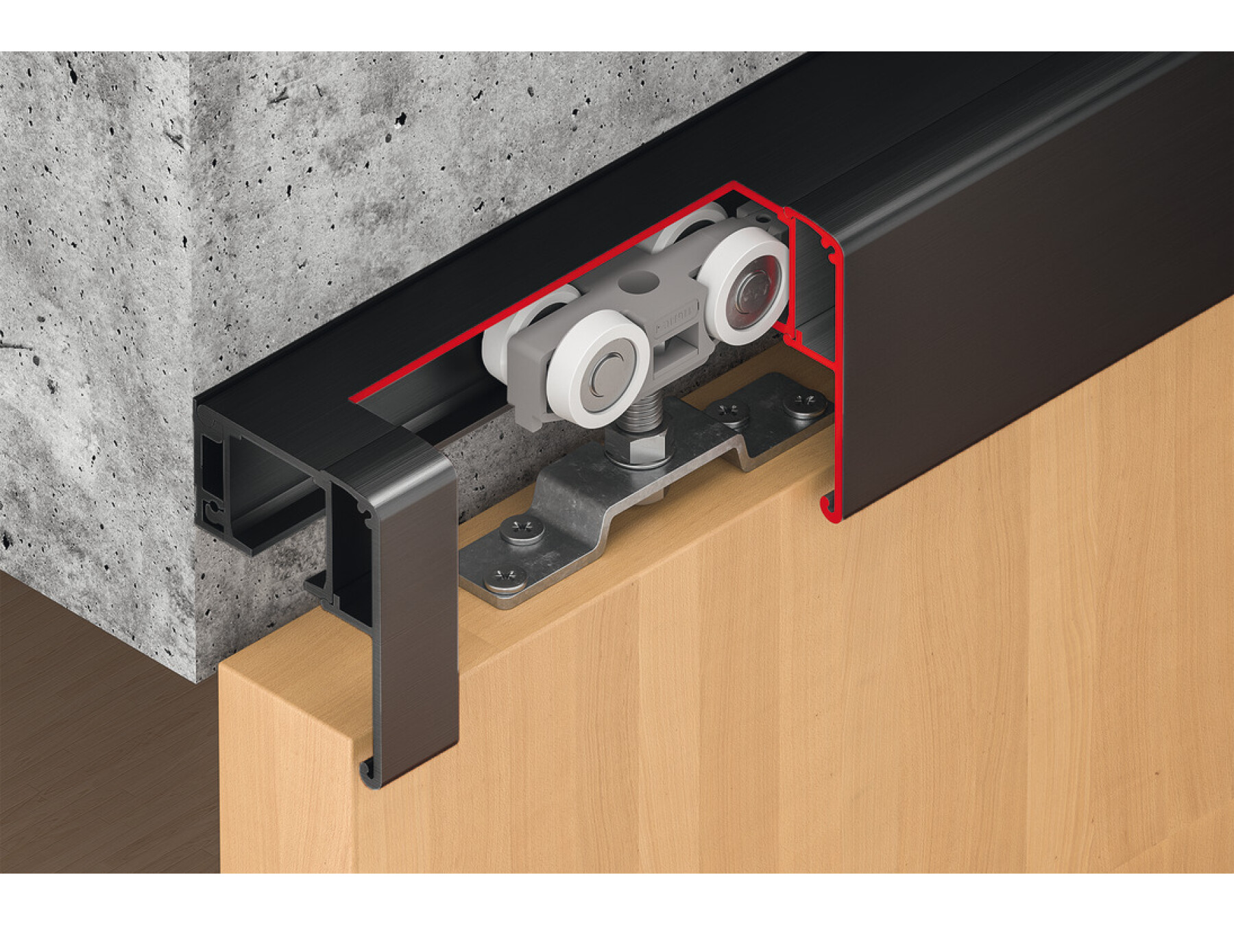 120-P fitting set without soft close consists of 2 x Running gear, 4 rollers, suspension screw with nut, galvanised steel, 2 x Track buffer, with retaining spring and rubber buffer, grey plastic, 1 x Bottom guide, 24 x 60 x 30 mm, black plastic
