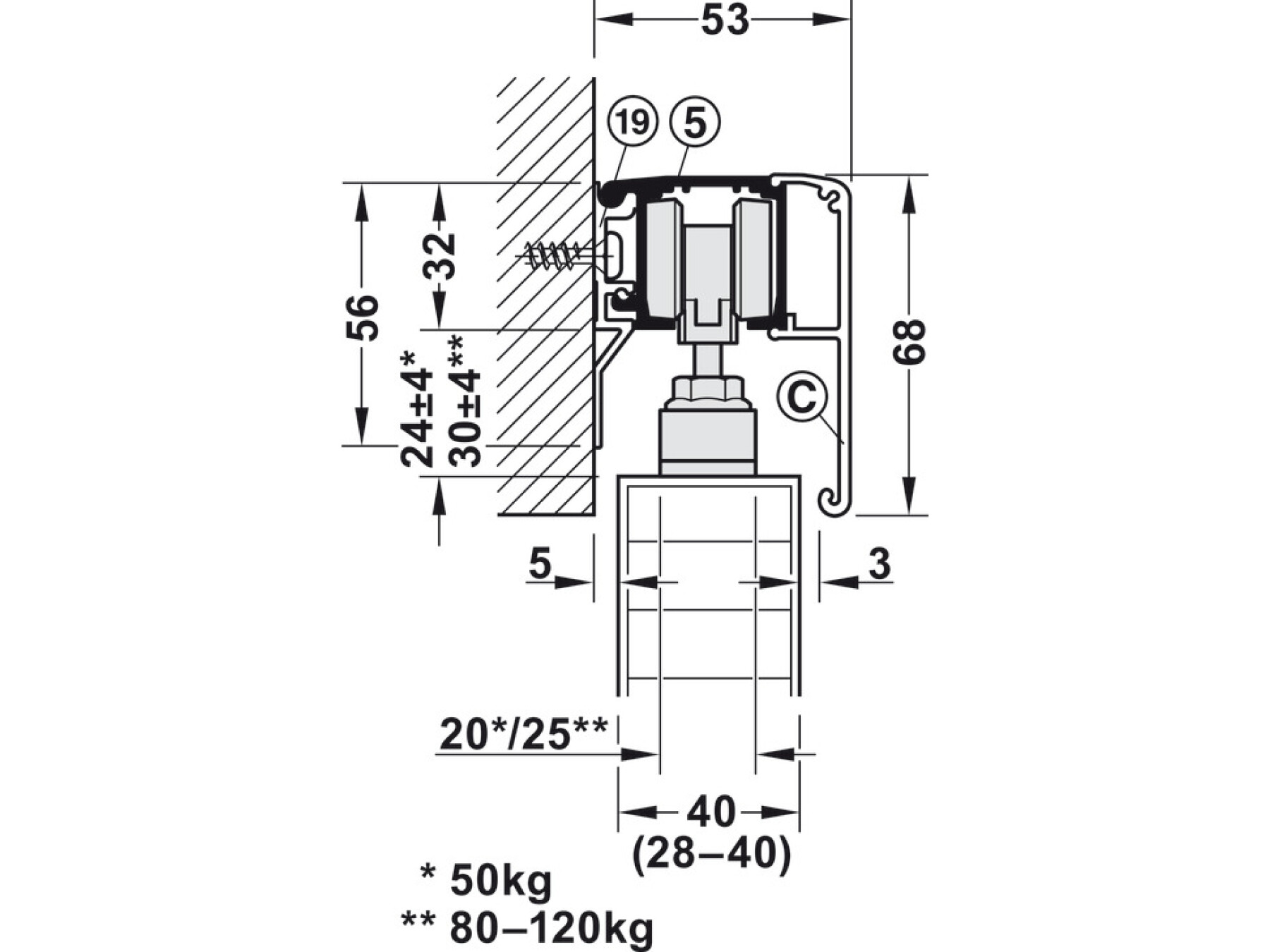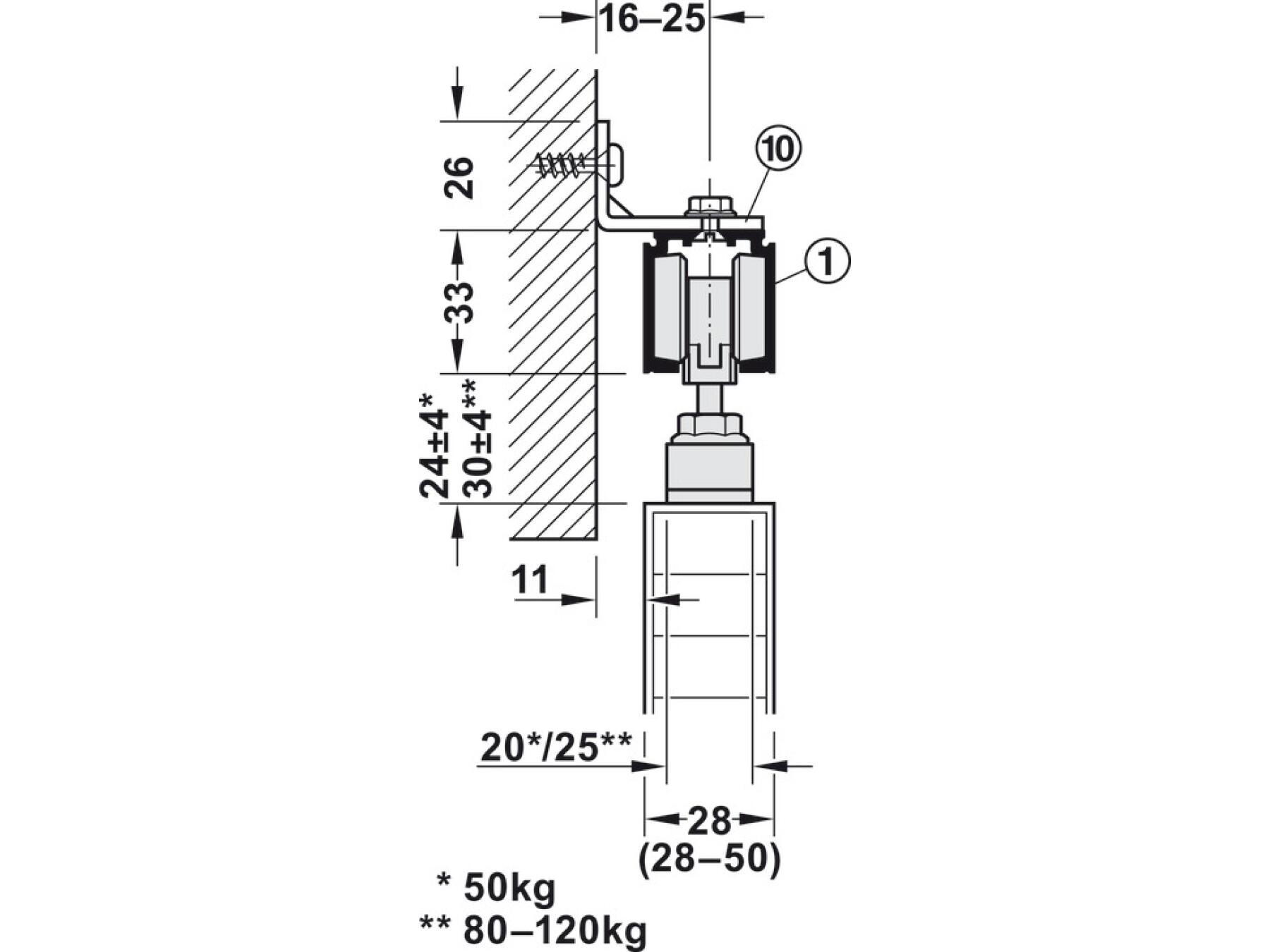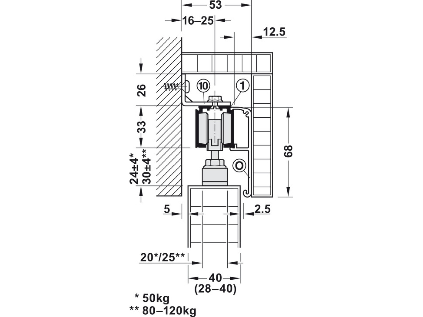 120-P fitting set without soft close consists of 2 x Running gear, 4 rollers, suspension screw with nut, galvanised steel, 2 x Track buffer, with retaining spring and rubber buffer, grey plastic, 1 x Bottom guide, 24 x 60 x 30 mm, black plastic