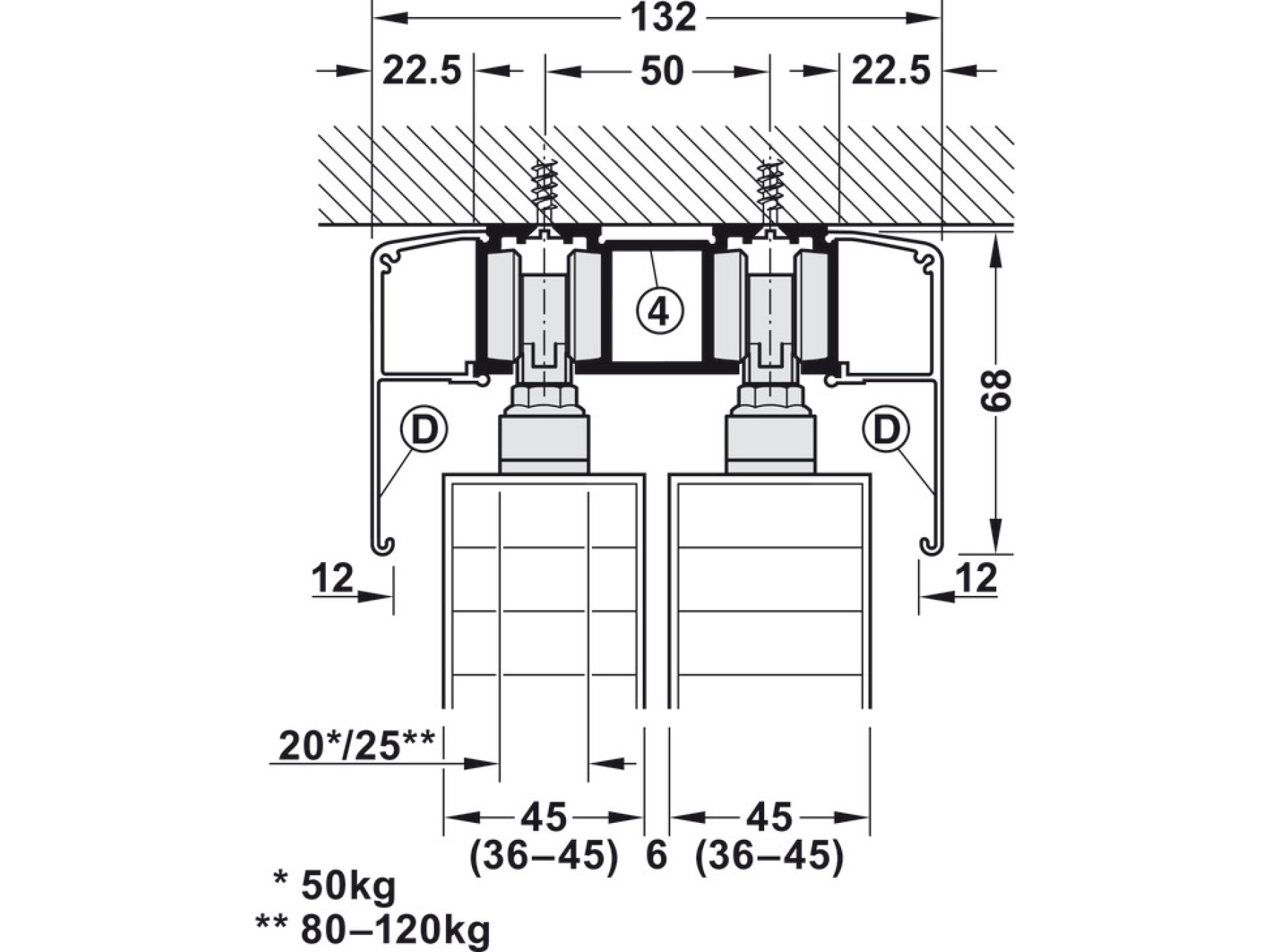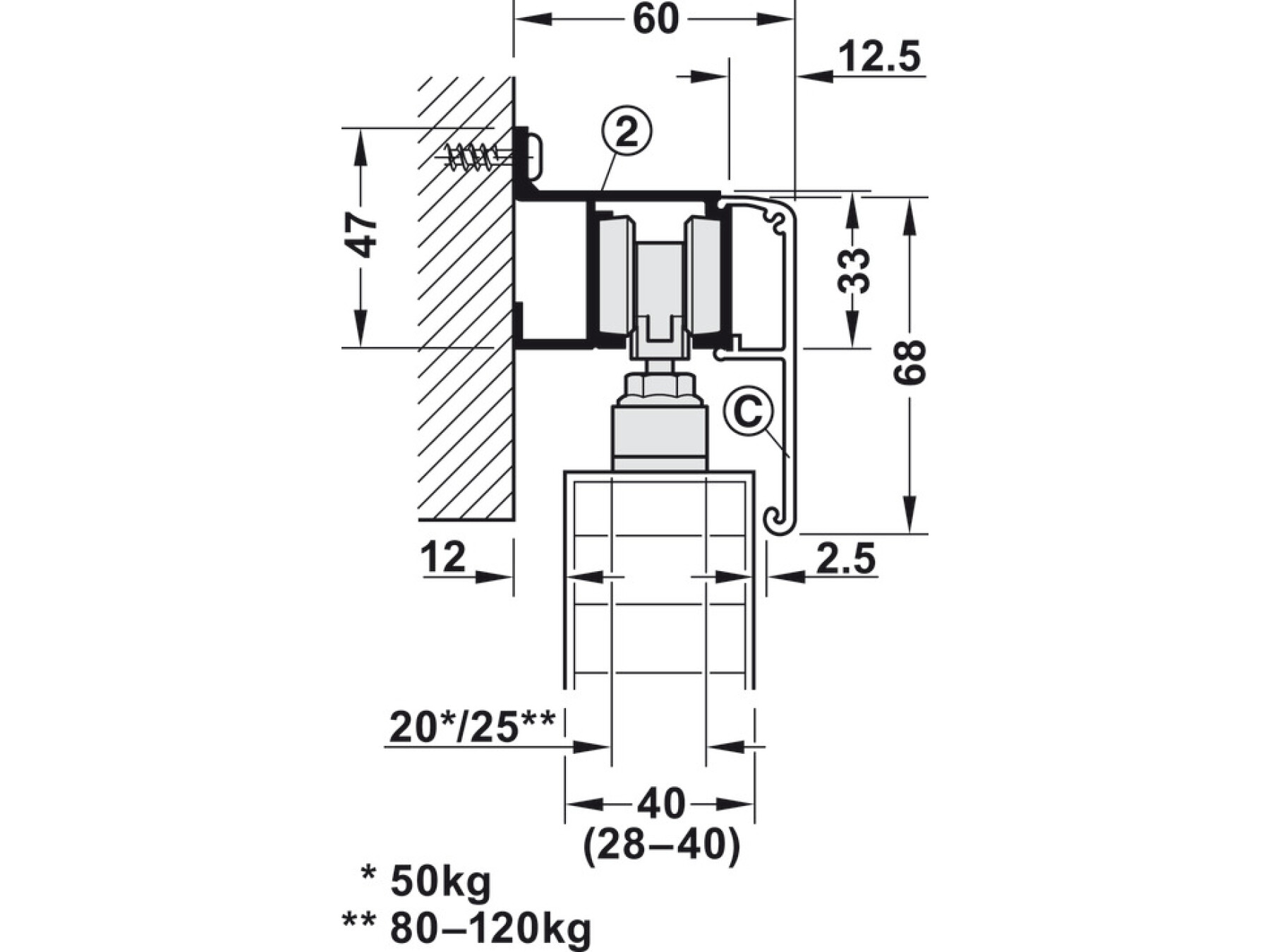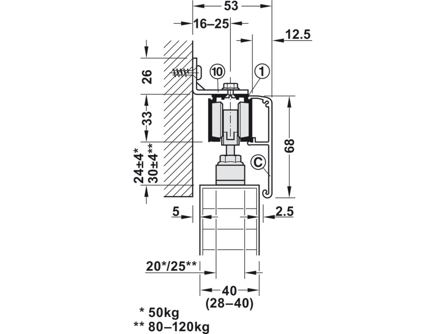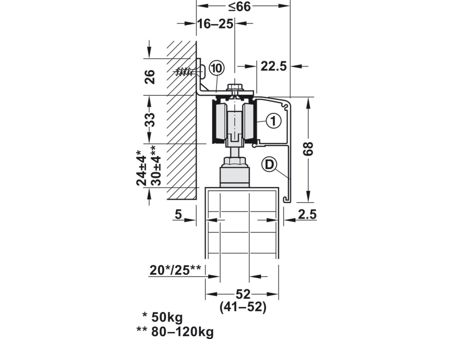 120-P fitting set without soft close consists of 2 x Running gear, 4 rollers, suspension screw with nut, galvanised steel, 2 x Track buffer, with retaining spring and rubber buffer, grey plastic, 1 x Bottom guide, 24 x 60 x 30 mm, black plastic