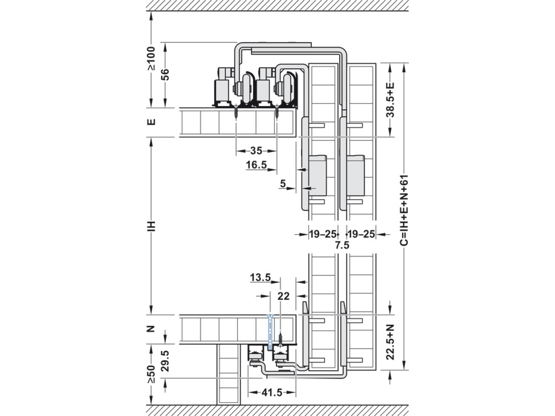 for 3 doors: Min. 350 mm with soft closing mechanism on one side, min. 820 mm with soft closing mechanism on both sides