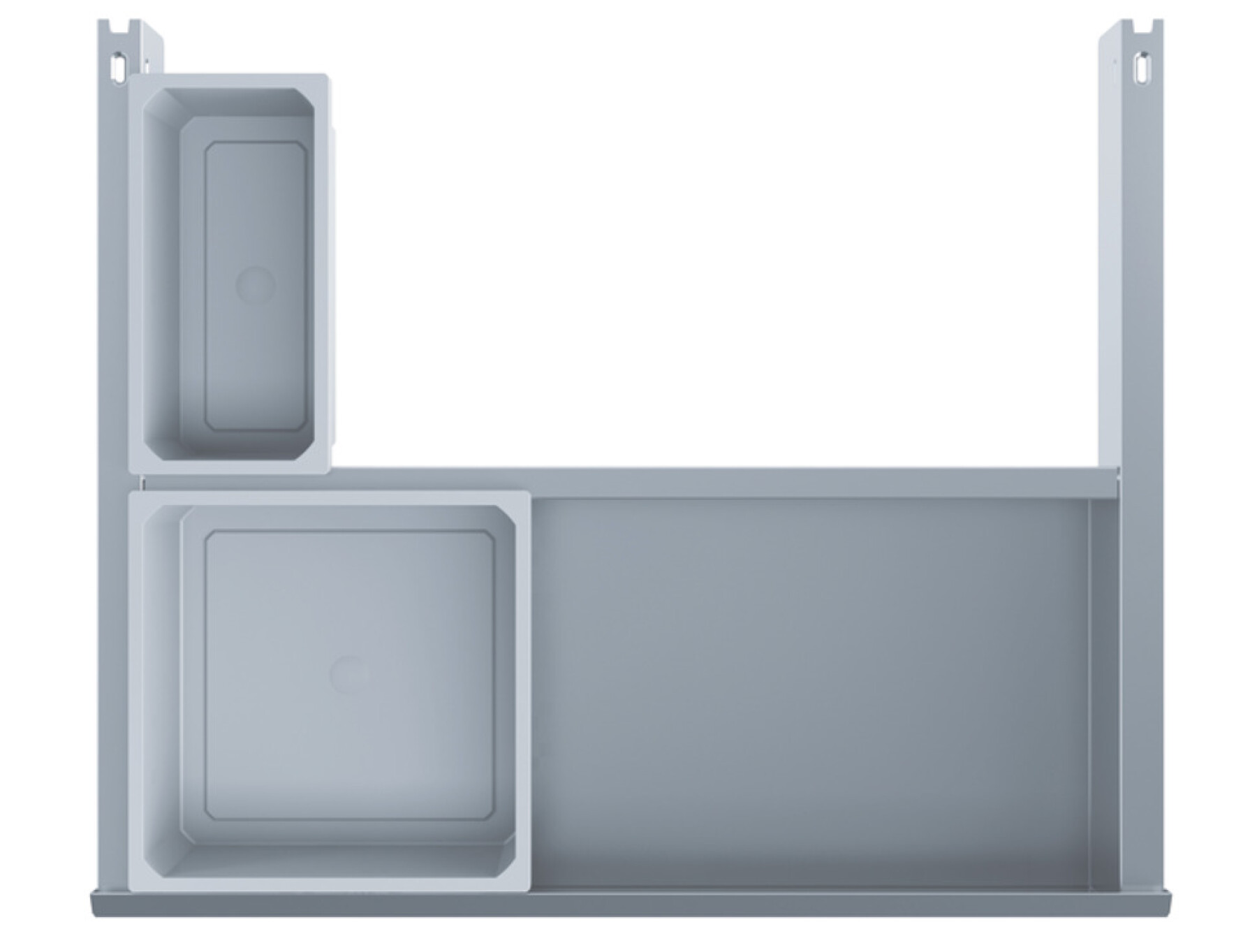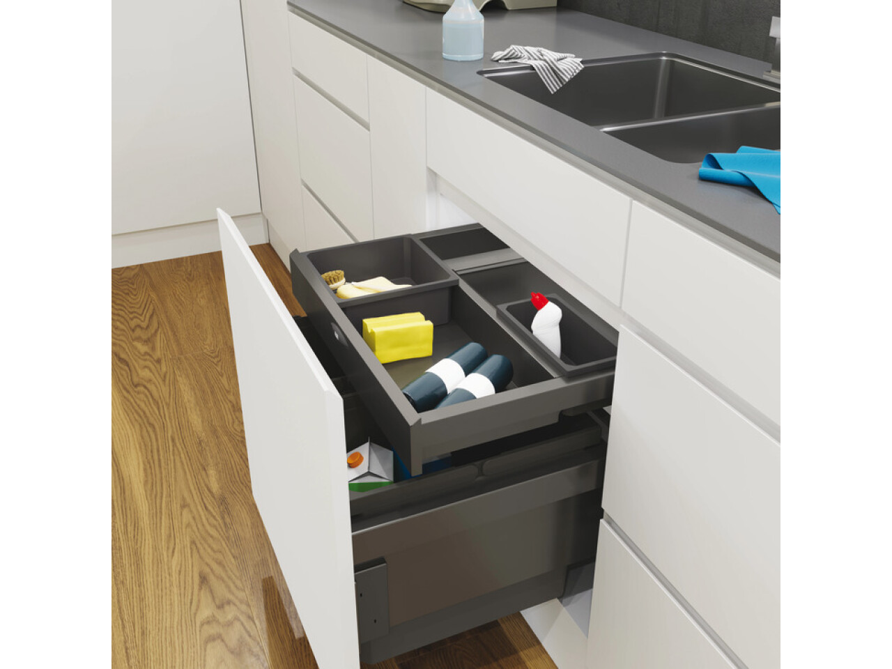 This innovative add on module acts as an organisation drawer and enhances the waste bin system. Expands the usable storage space with a drawer holding containers for cleaning and kitchen consumables. Depending on the position of the water connections, plastic containers can suspended in the powder coated metal framework