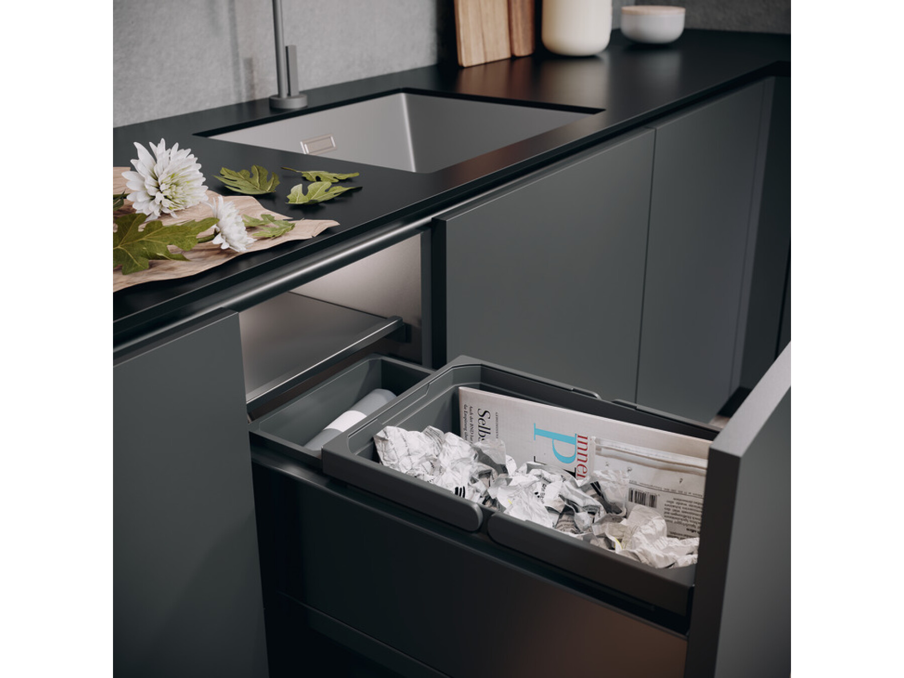 The space-saving VS ENVI® Space XX can be installed laterally in a very small kitchen unit, providing high-capacity, convenient waste disposal close to the worktop.
