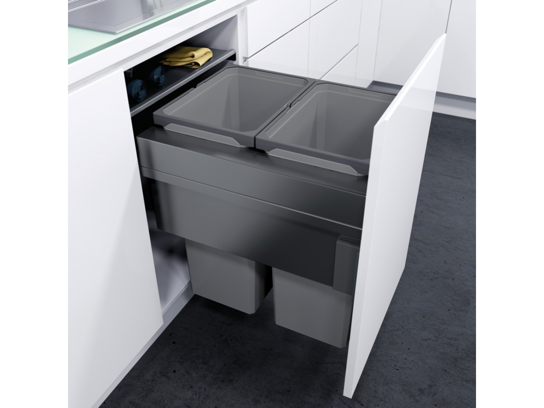 The space-saving VS ENVI® Space XX can be installed laterally in a very small kitchen unit, providing high-capacity, convenient waste disposal close to the worktop.