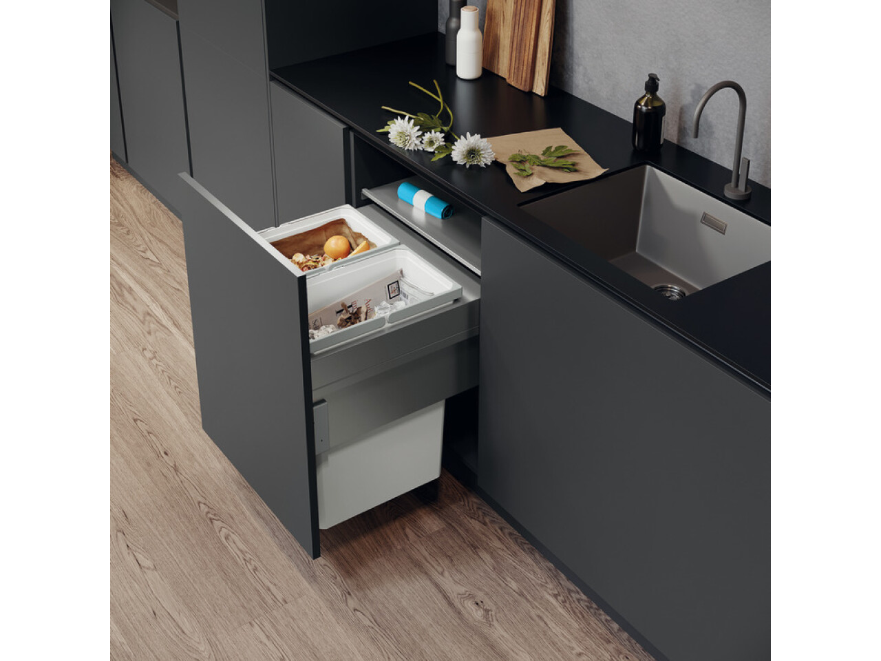The space-saving VS ENVI® Space XX can be installed laterally in a very small kitchen unit, providing high-capacity, convenient waste disposal close to the worktop.