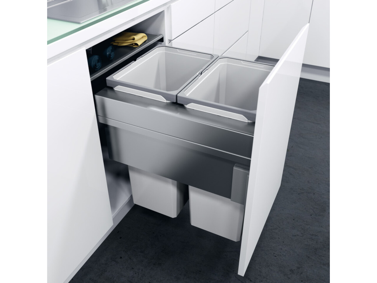 The space-saving VS ENVI® Space XX can be installed laterally in a very small kitchen unit, providing high-capacity, convenient waste disposal close to the worktop.